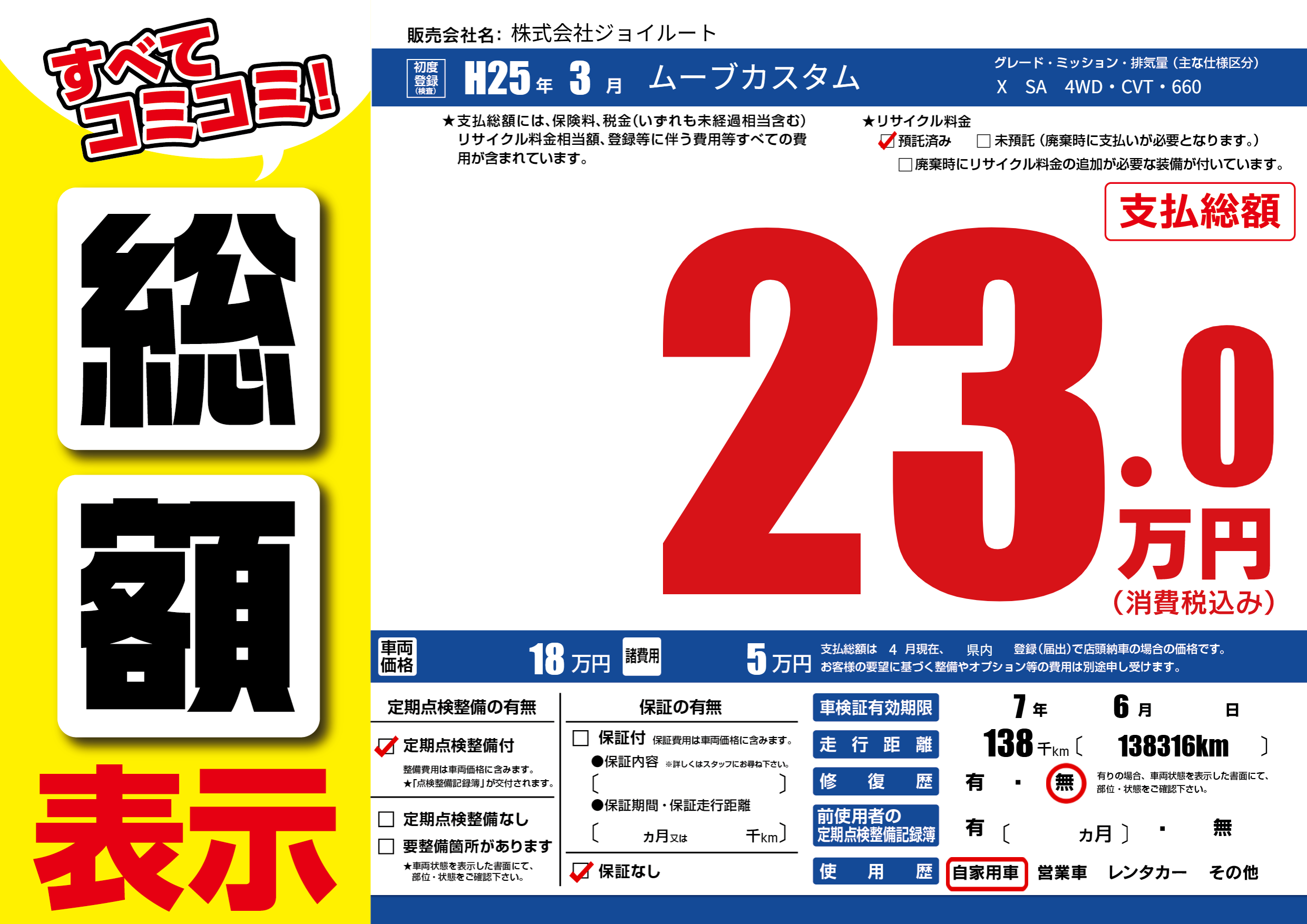 | 走行キロ | 13.8万km | 初年度登録 | H25年3月 |