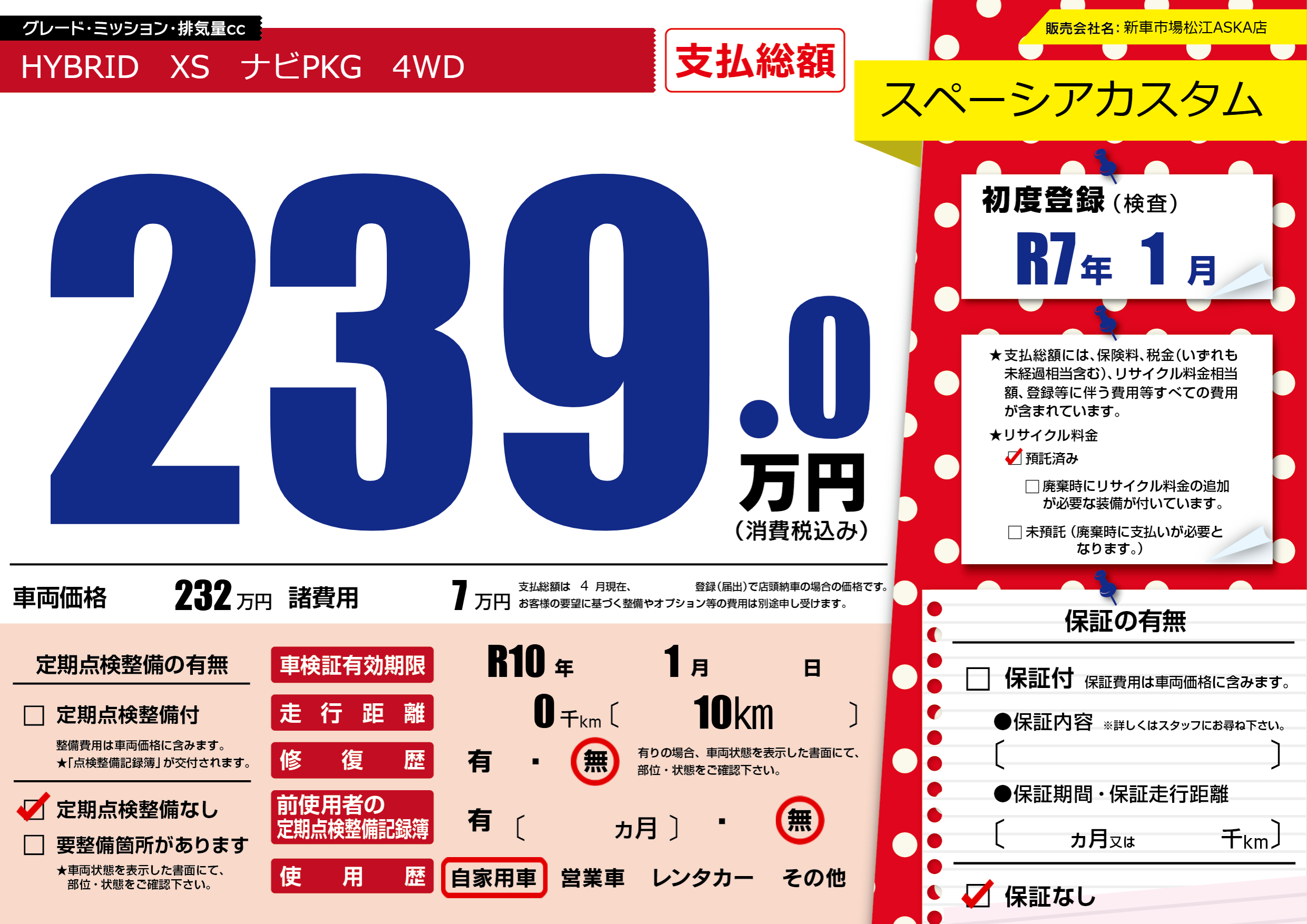 | 車名 | スペーシアカスタム | グレード ミッション 排気量 |