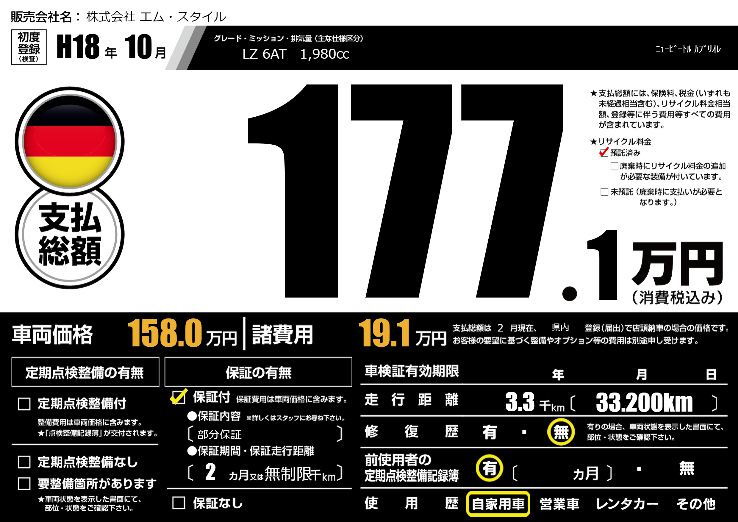 | 走行キロ | 0.3万km | 初年度登録 | H18年10月 |
