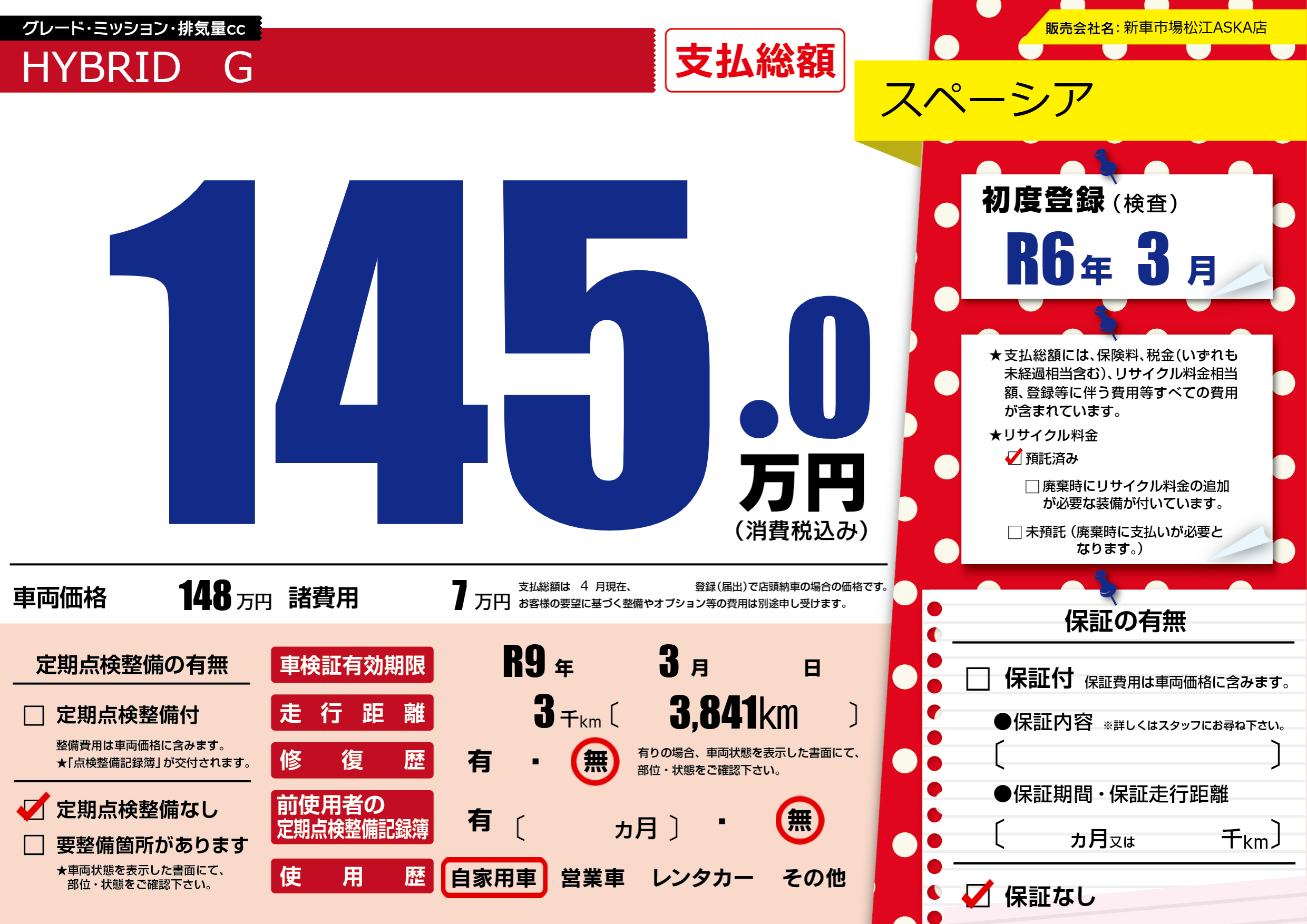 なし | 車検制限 | R9年3月---月 |