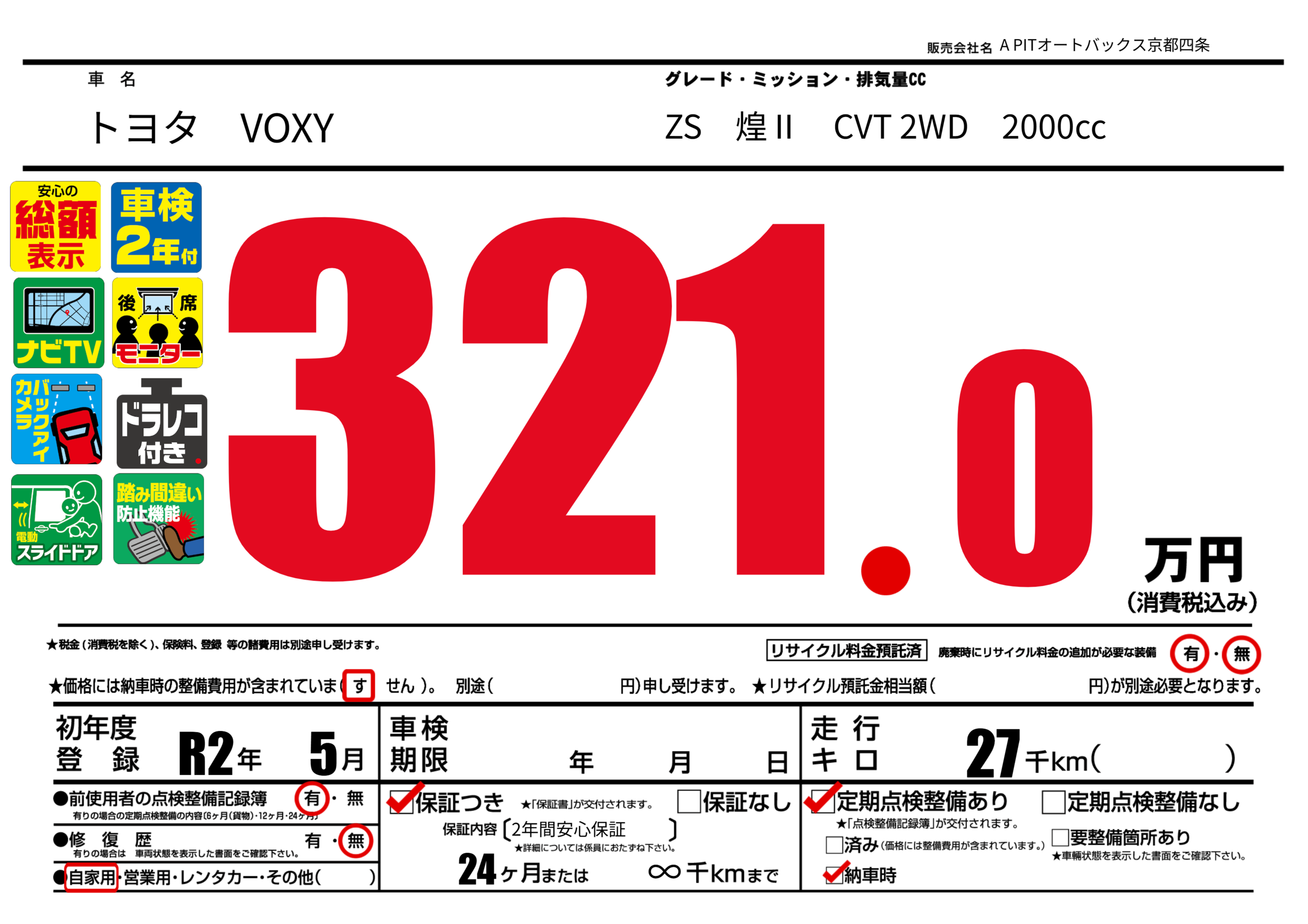 | 車名 | トヨタ VOXY | グレード ミッション 排気量 |