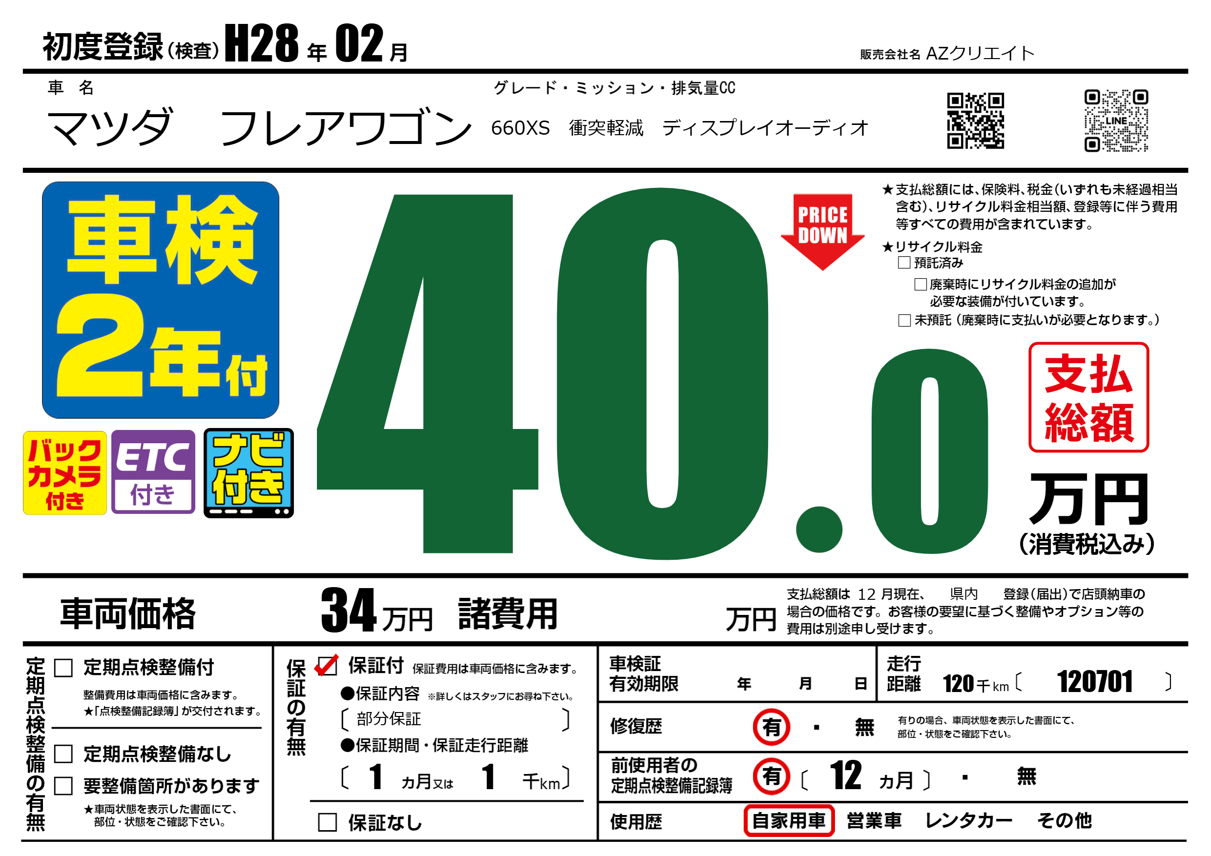| 走行キロ | 12万km | 初年度登録 | H28年02月 |
