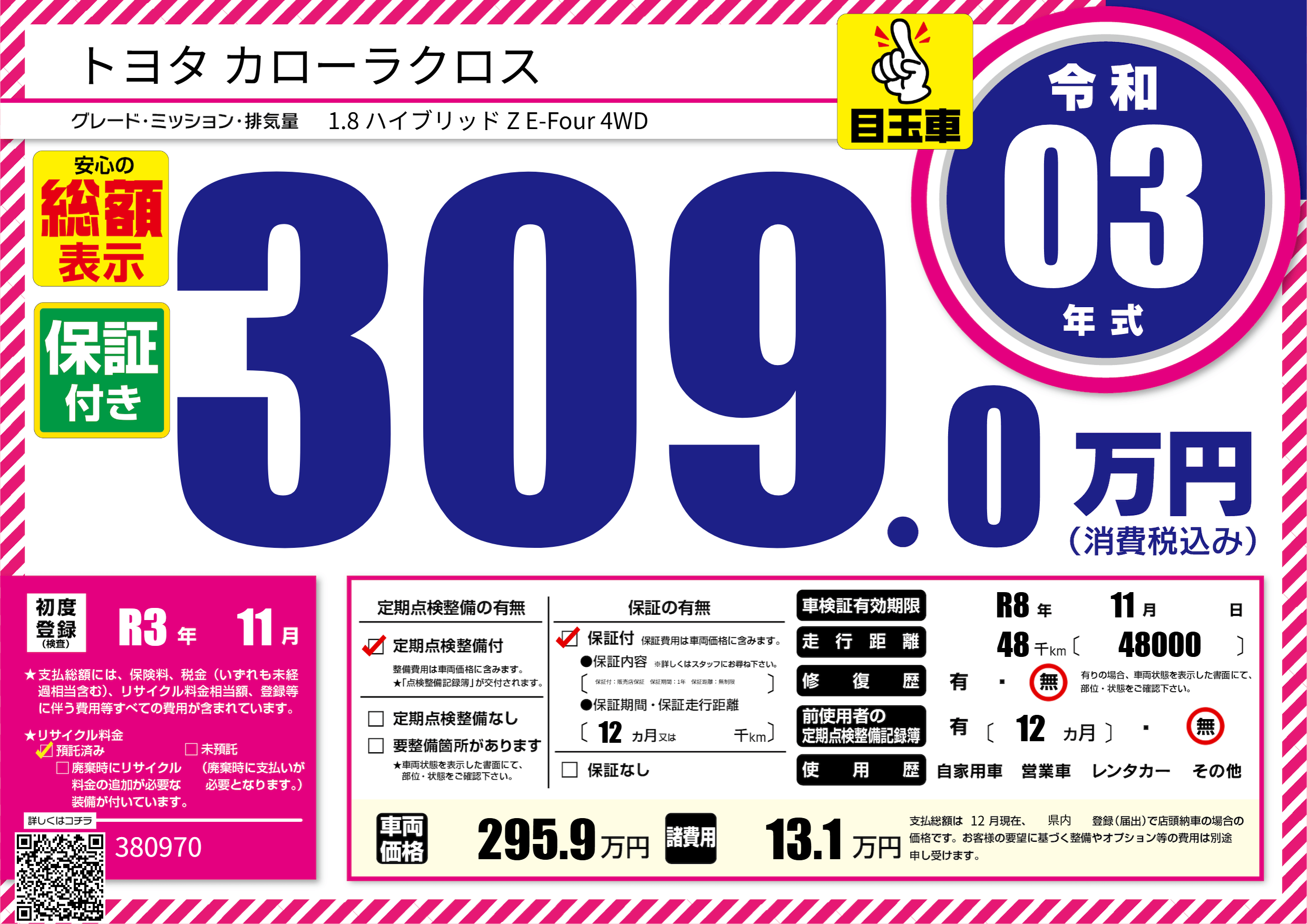 | 車名 | トヨタ カローラクロス | グレード ミッション 排気量 |