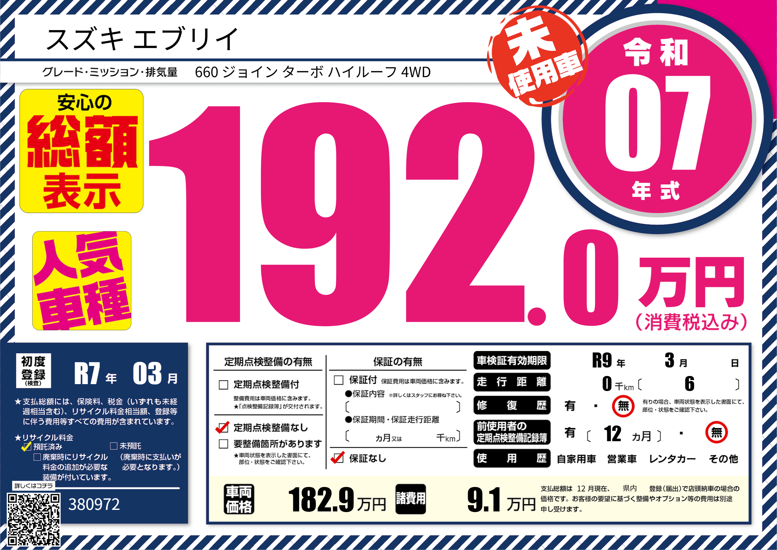 | 走行キロ | - | 初年度登録 | R7年03月 |