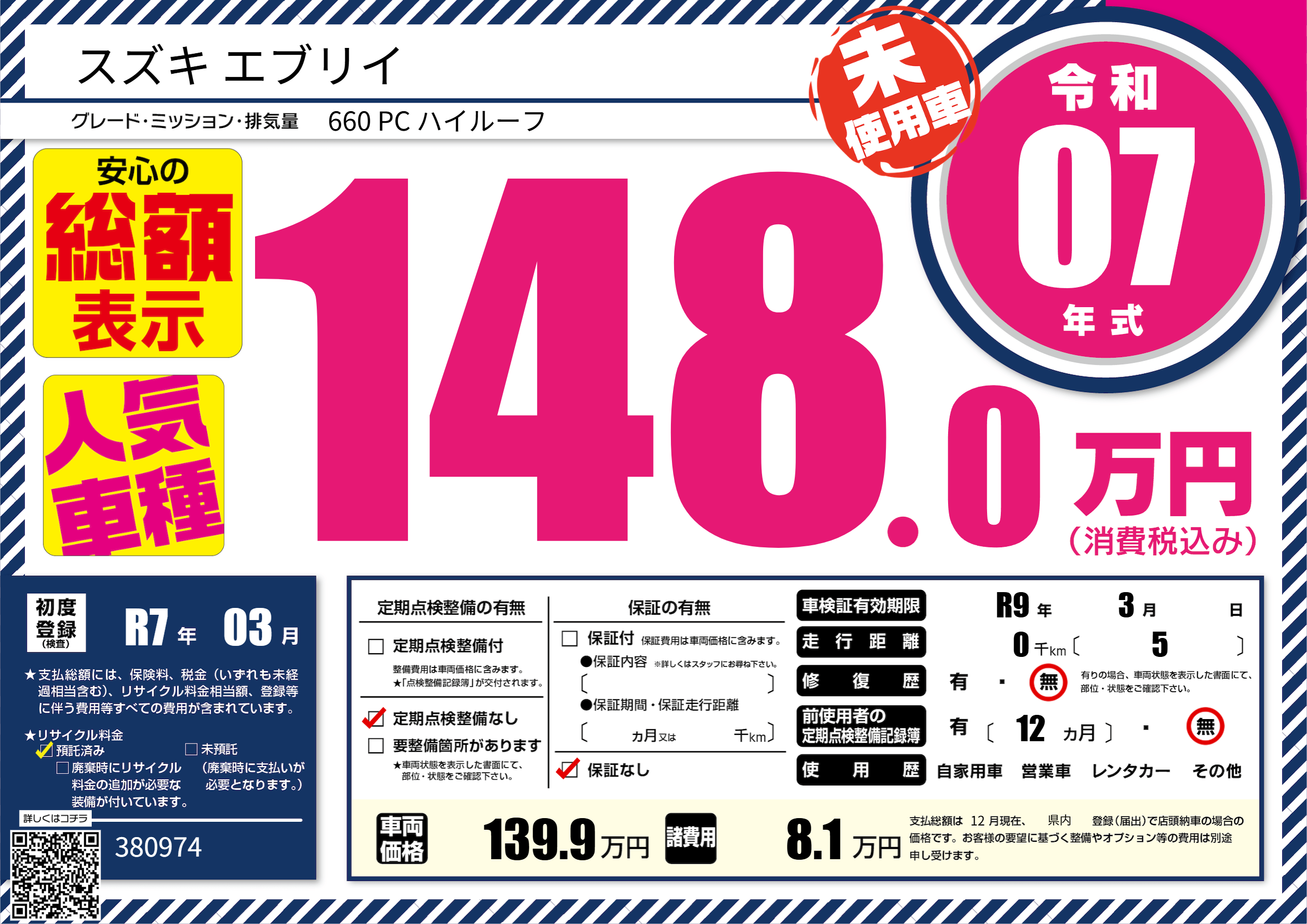 | 走行キロ | - | 初年度登録 | R7年03月 |
