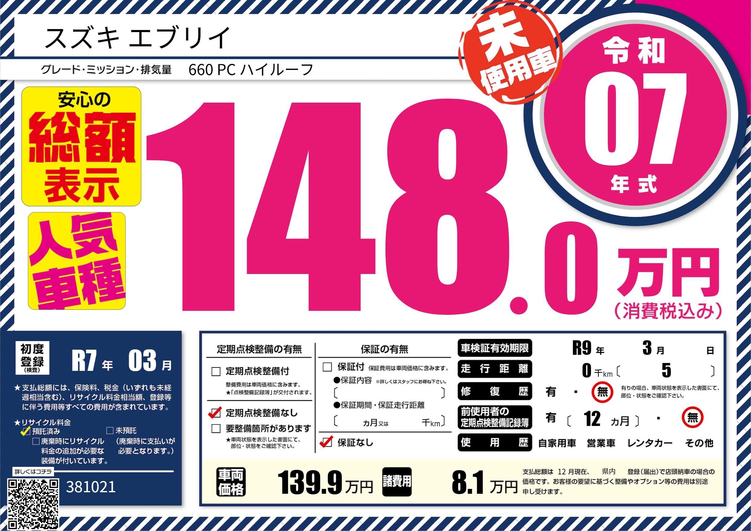 | 走行キロ | - | 初年度登録 | R7年03月 |