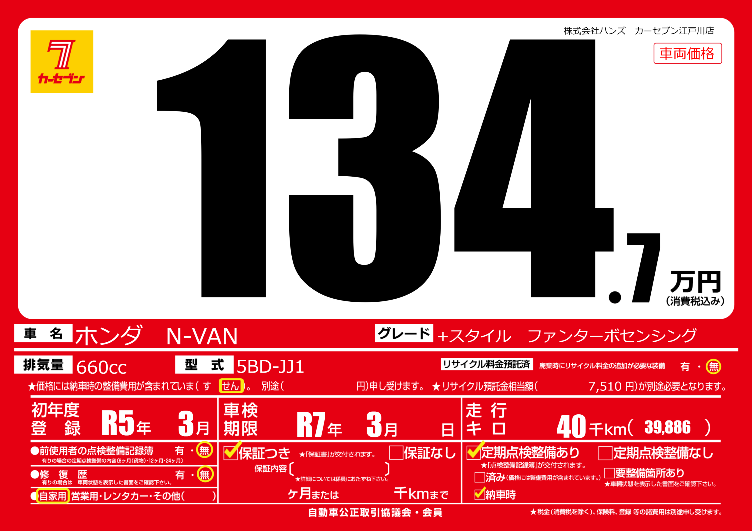 | 車検制限 | R7年 3月 - 日 | ||