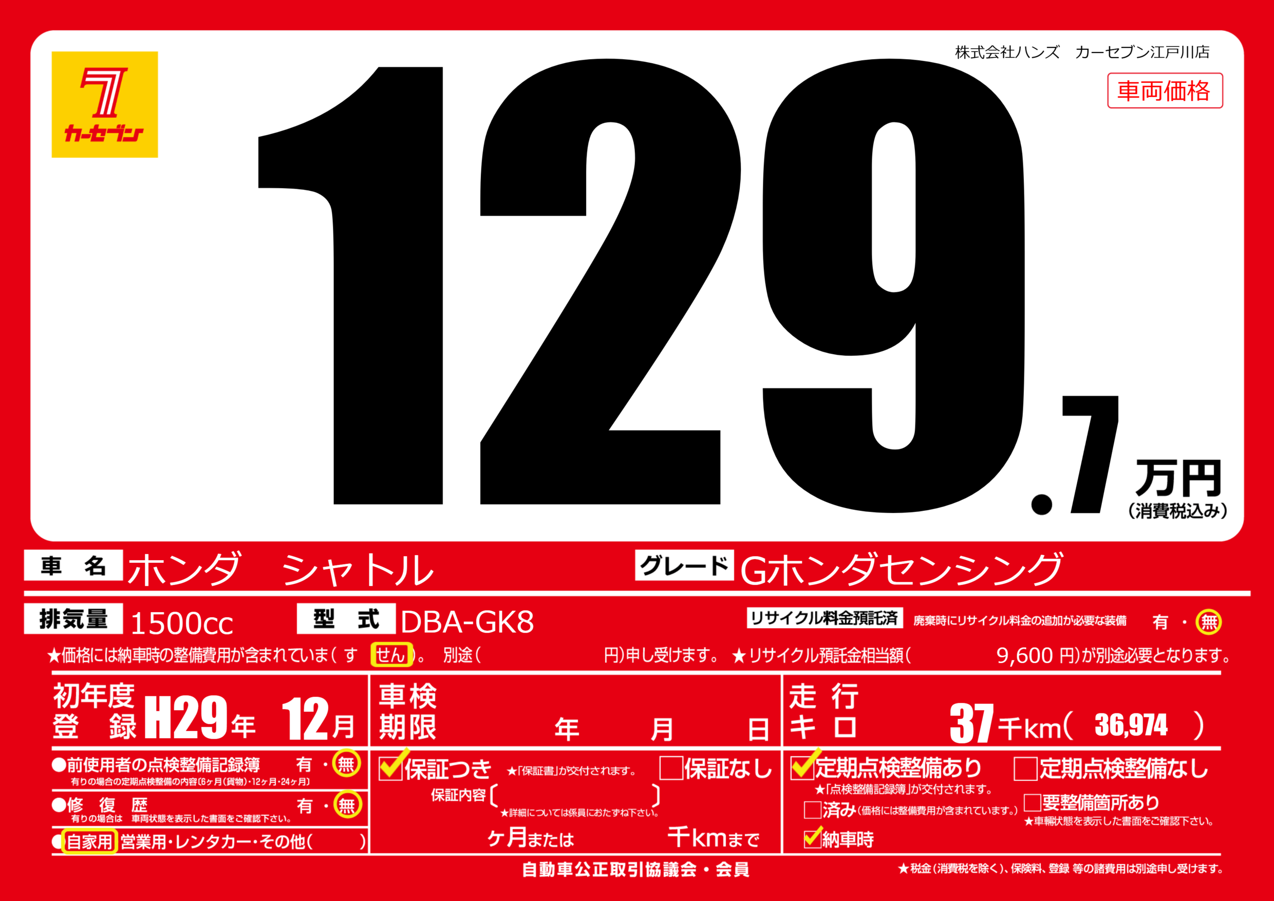 | 車名 | ホンダ シャトル | グレード ミッション 排気量 |