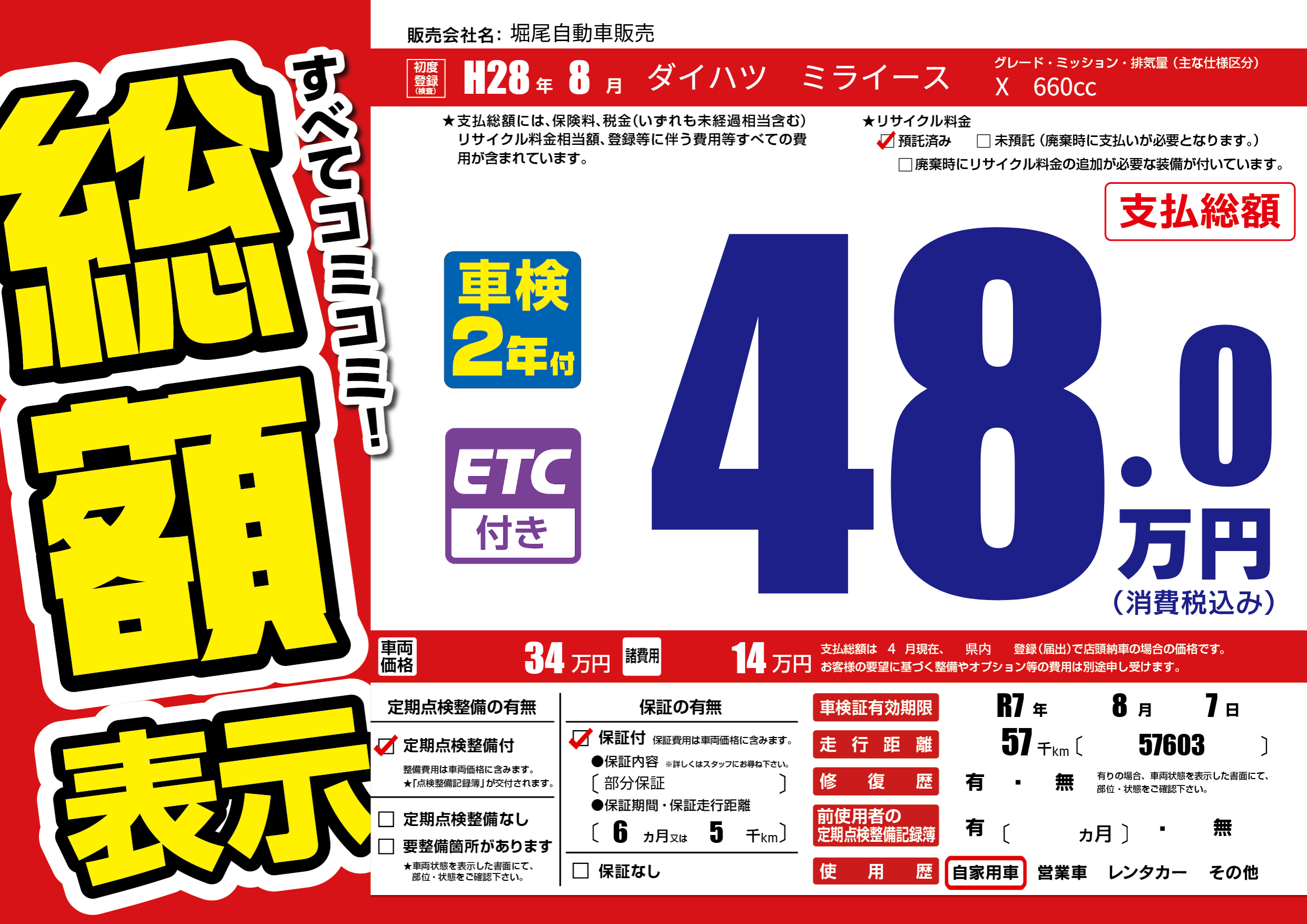 | 走行キロ | 5.7万km | 初年度登録 | H28年8月 |