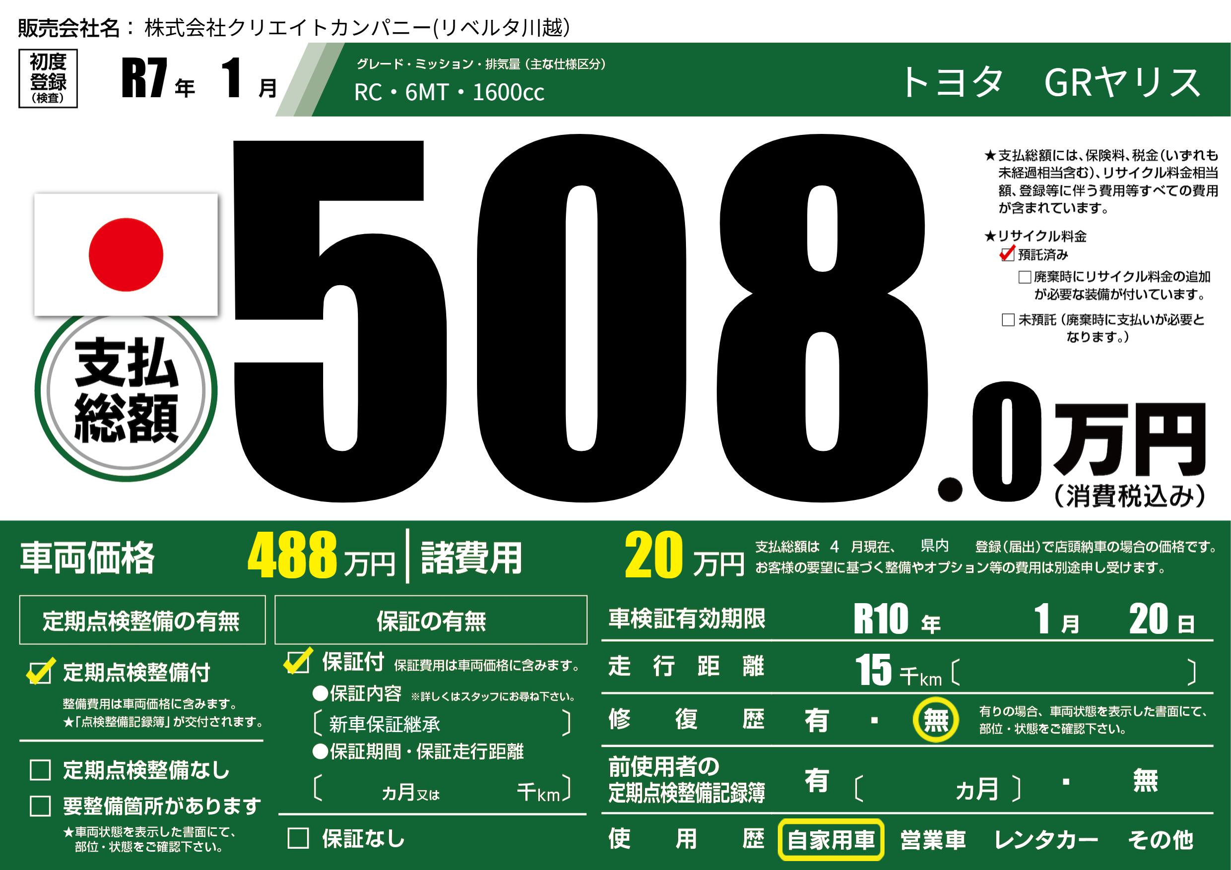 | 車名 | トヨタ GRヤリス | グレード ミッション 排気量 |