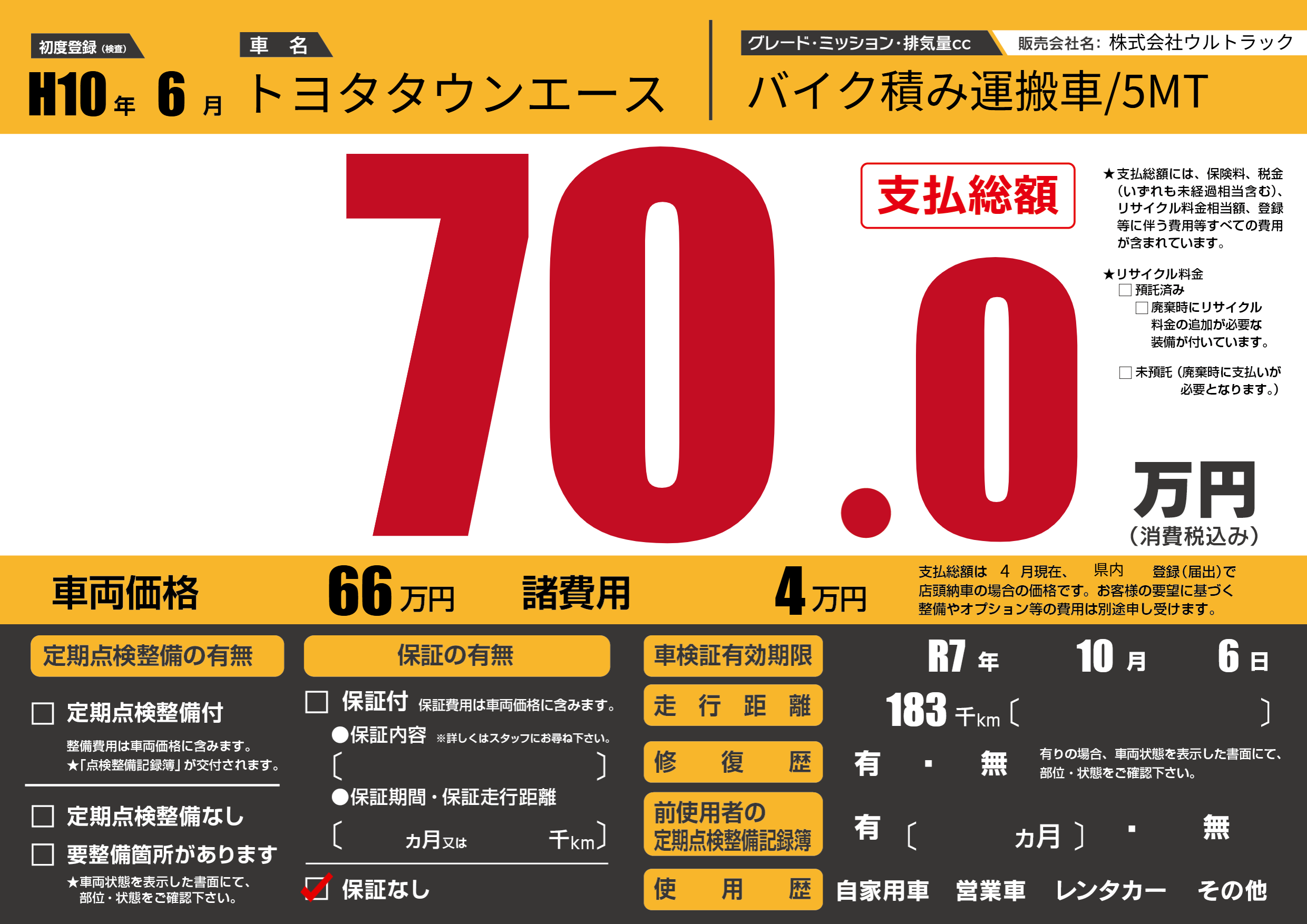 | 走行キロ | 18.3万km | 初年度登録 | H10年6月 |