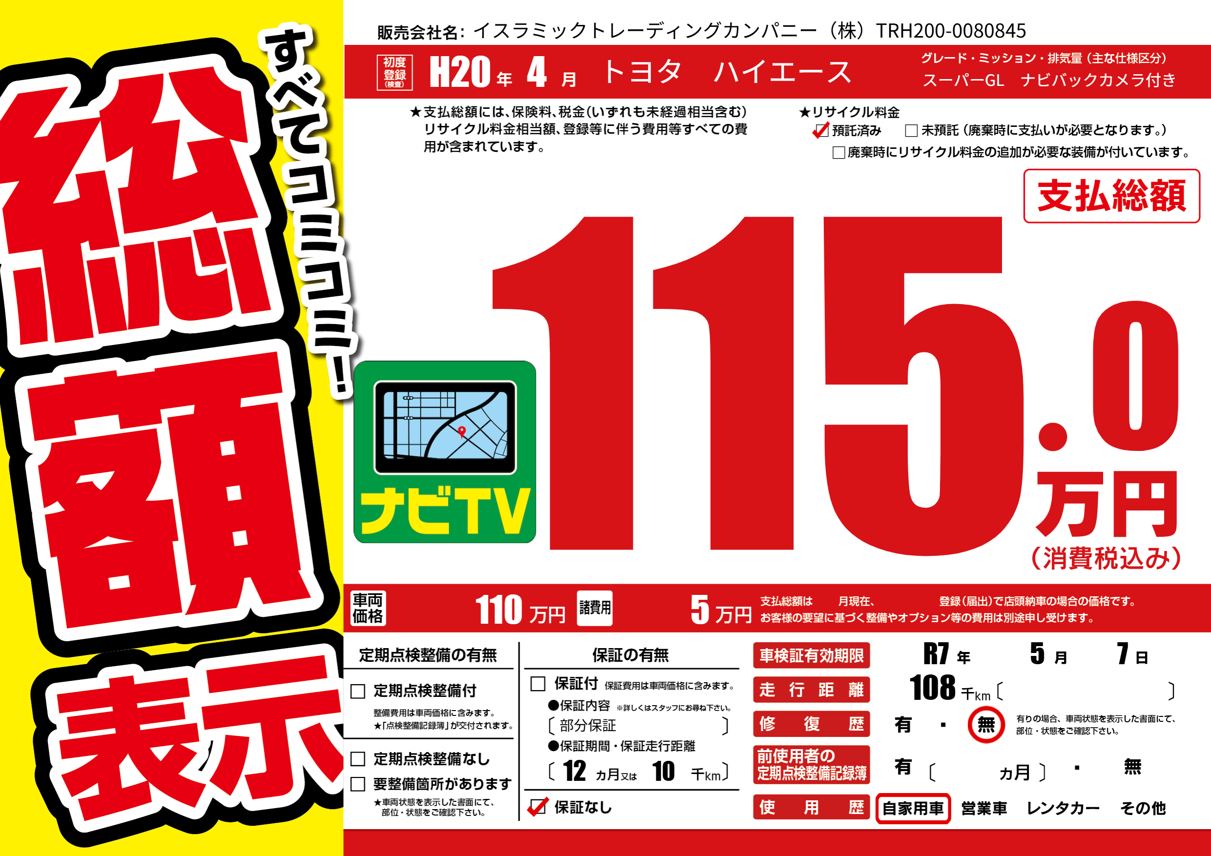 | 走行キロ | 10.8万km | 初年度登録 | H20年4月 |