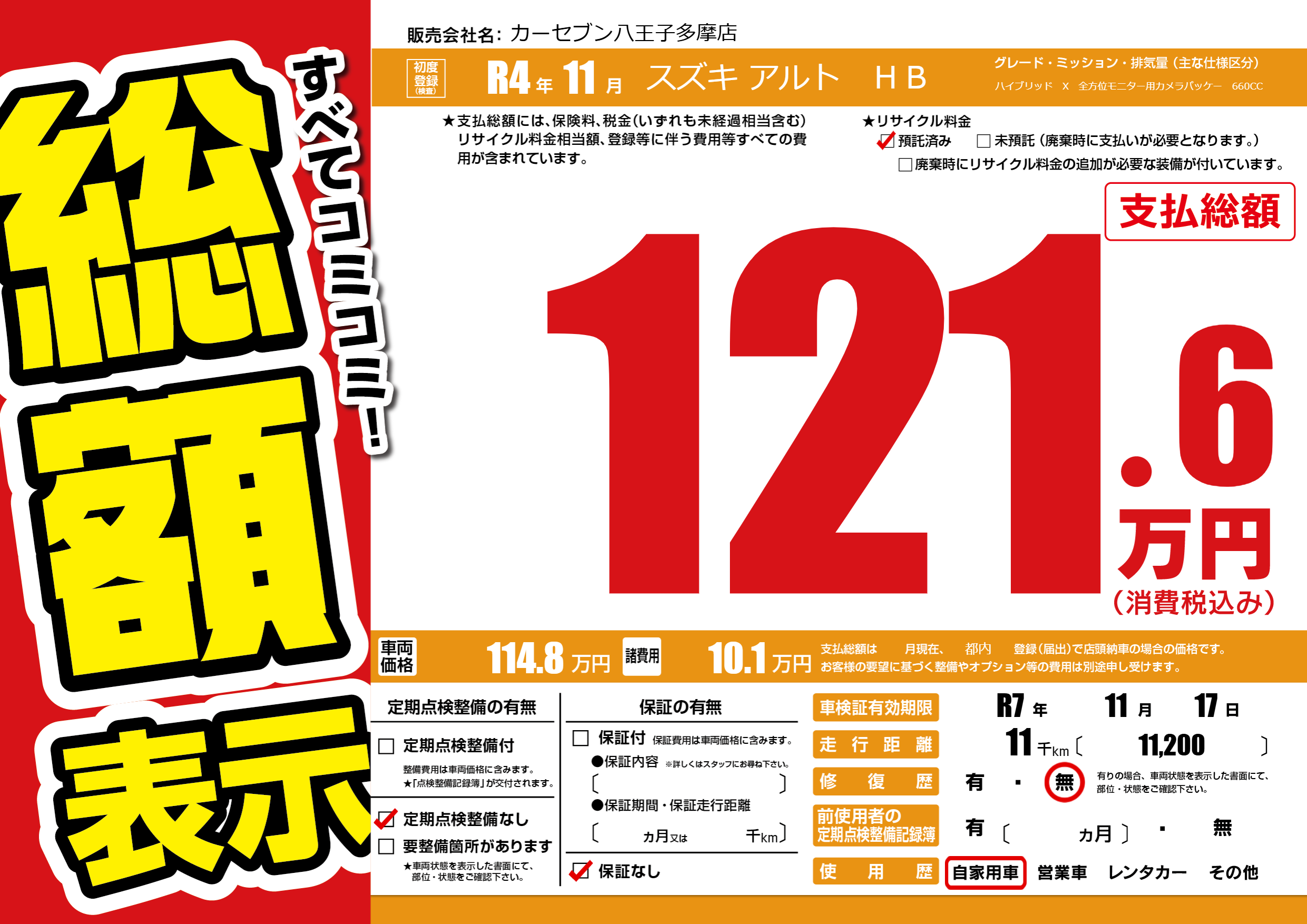 | 走行キロ | 1.1万km | 初年度登録 | R4年11月 |