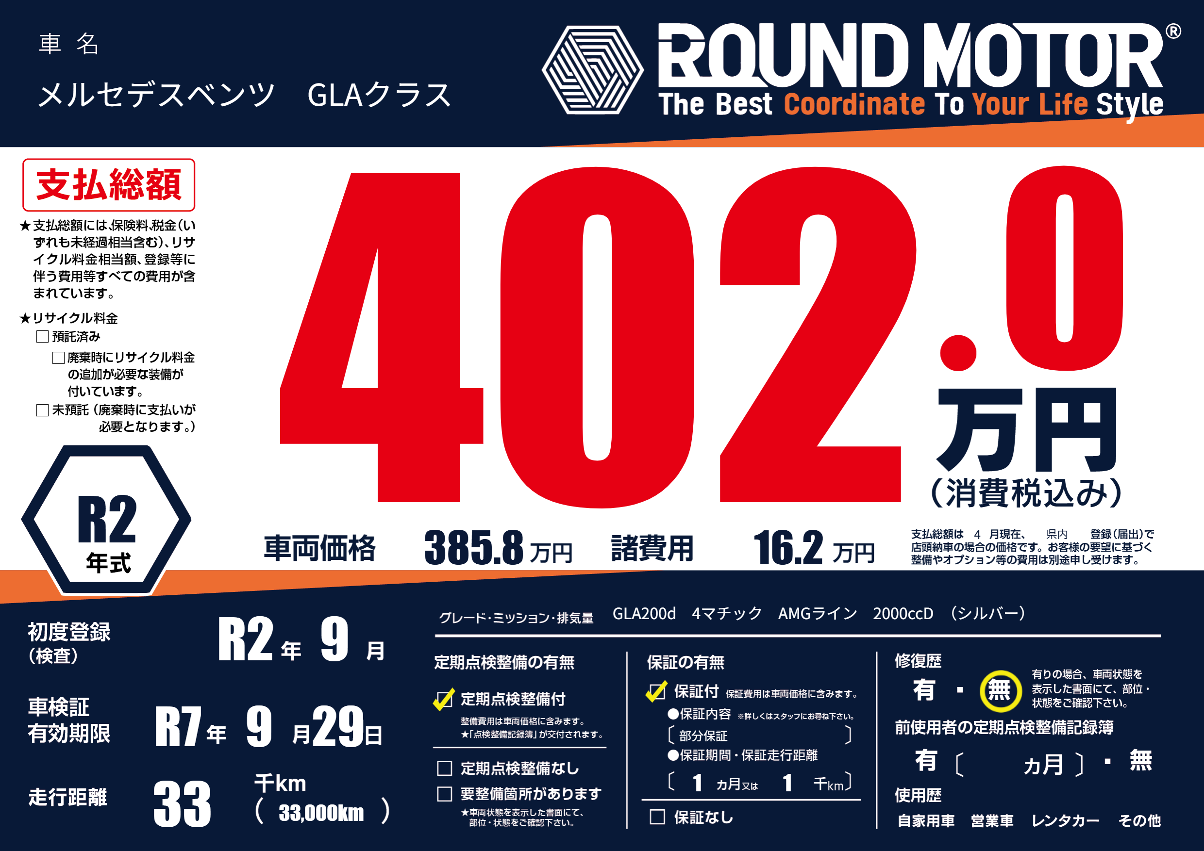 | 車名 | メルセデスベンツ GLAクラス | グレード ミッション 排気量 |