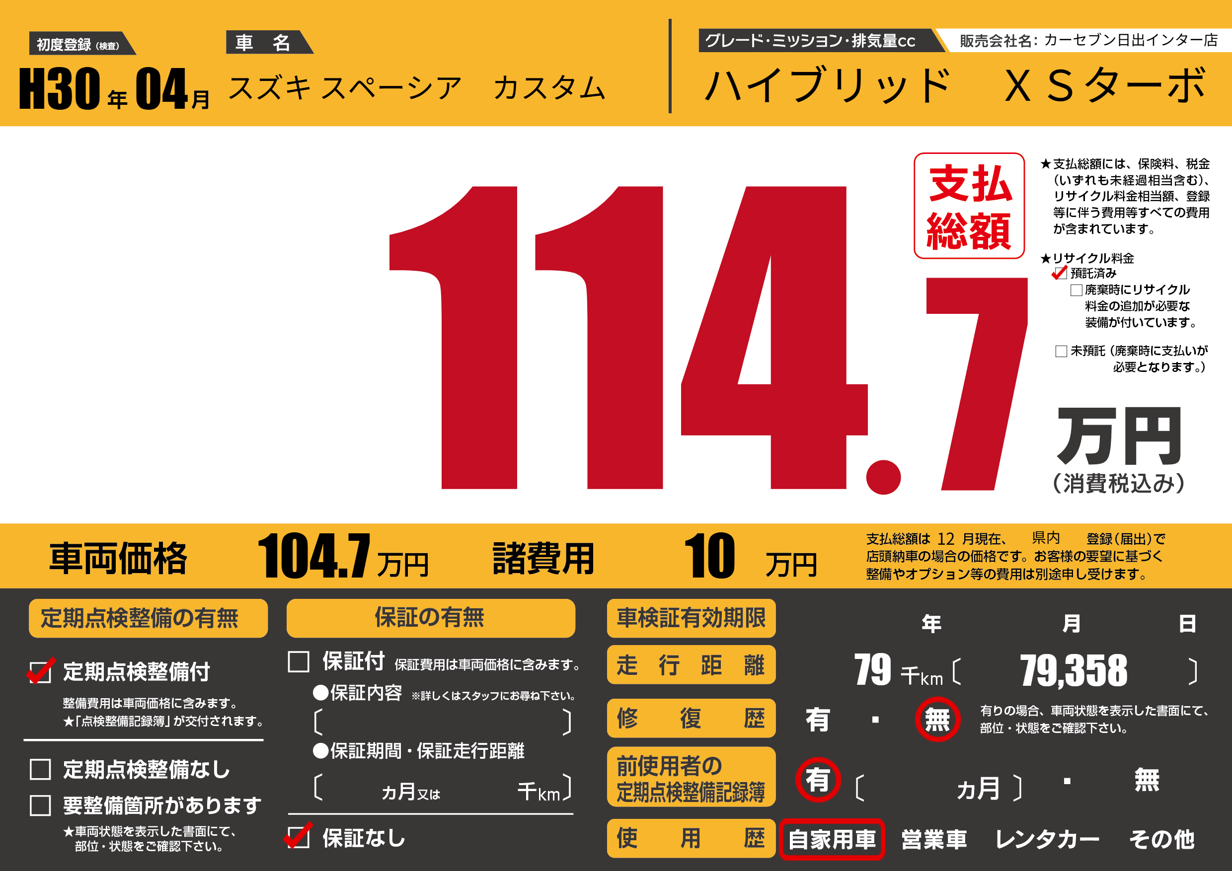 | 車名 | スズキ スペーシア カスタム | グレード ミッション 排気量 |