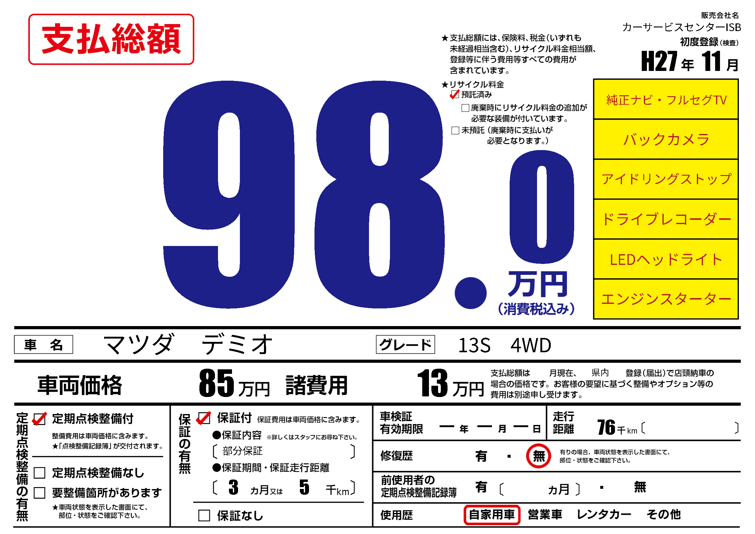 | 車名 | マツダ デミオ | グレード ミッション 排気量 |