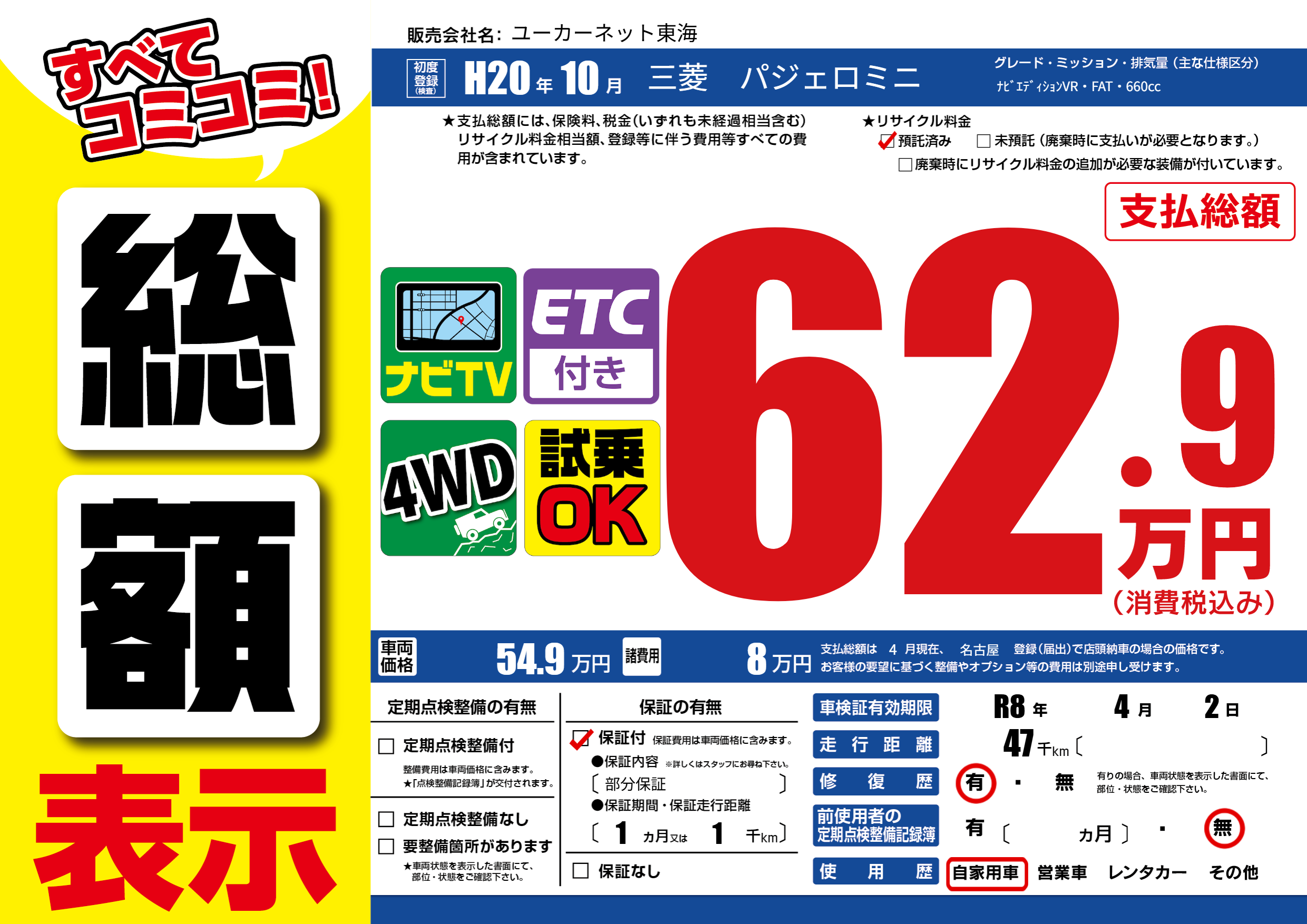 | 車名 | 三菱 パジェロミニ | グレード ミッション 排気量 |