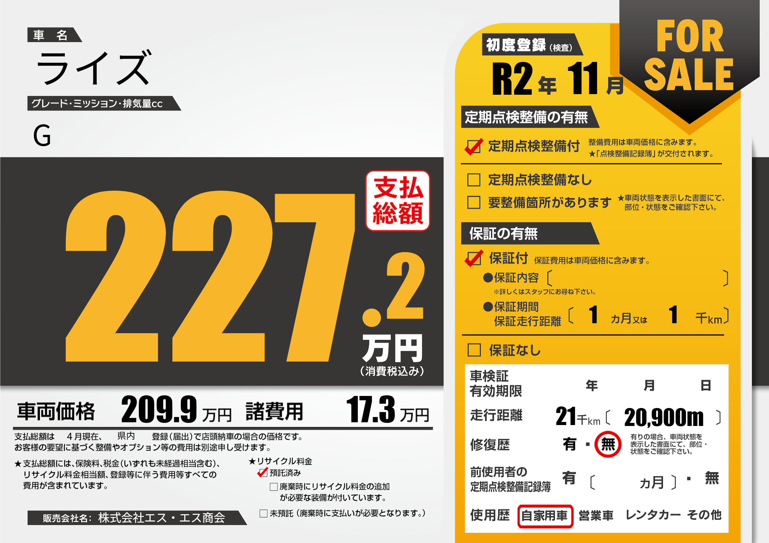 | 走行キロ | 2.1万km | 初年度登録 | R2年11月 |