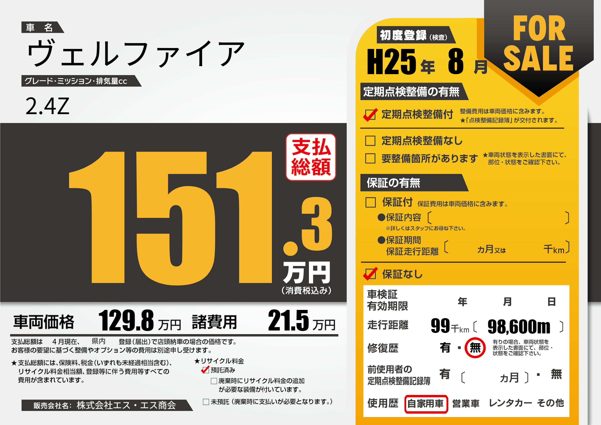 | 車名 | ヴェルファイア | グレード ミッション 排気量 |