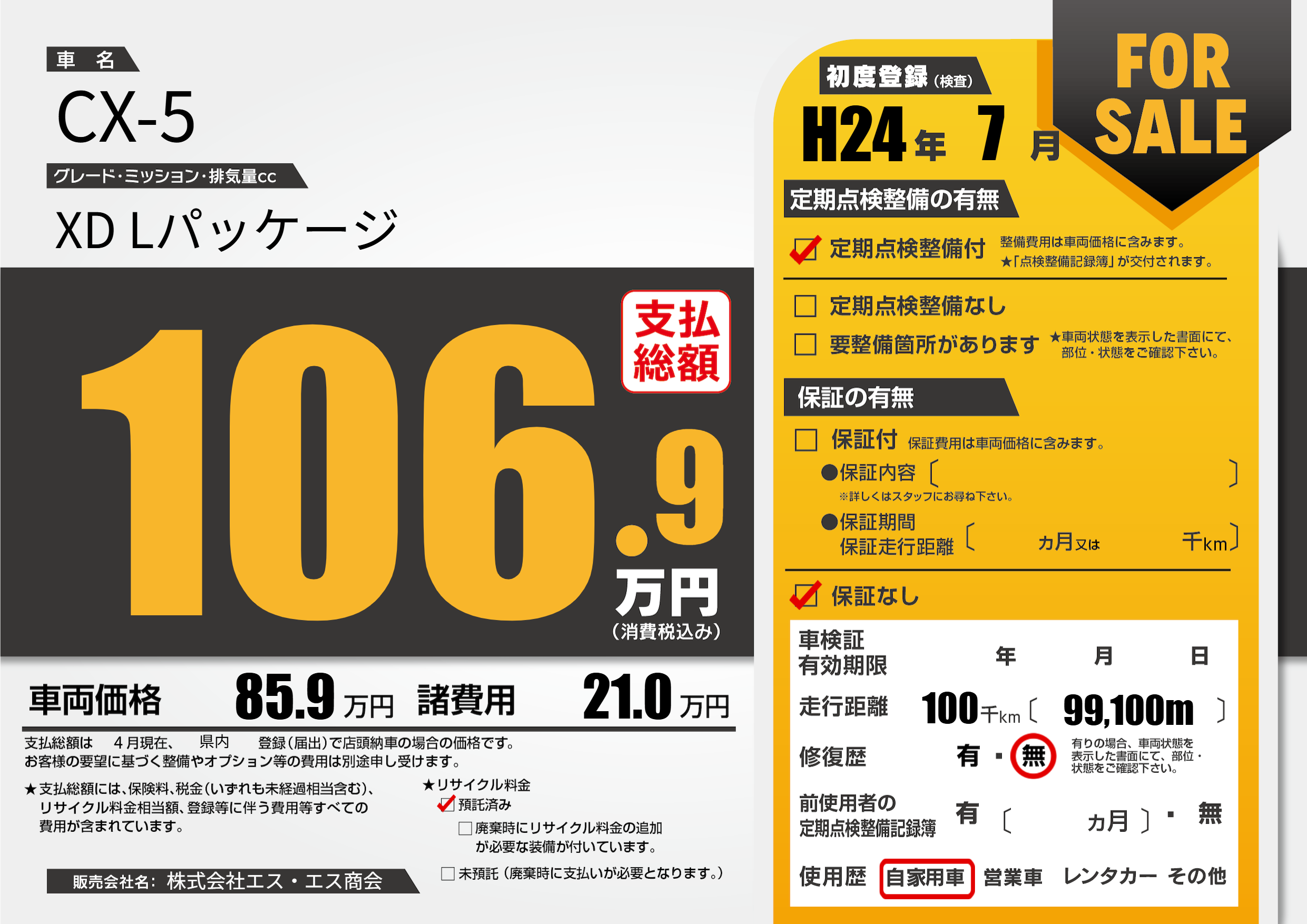 | 走行キロ | 10万km | 初年度登録 | H24年7月 |