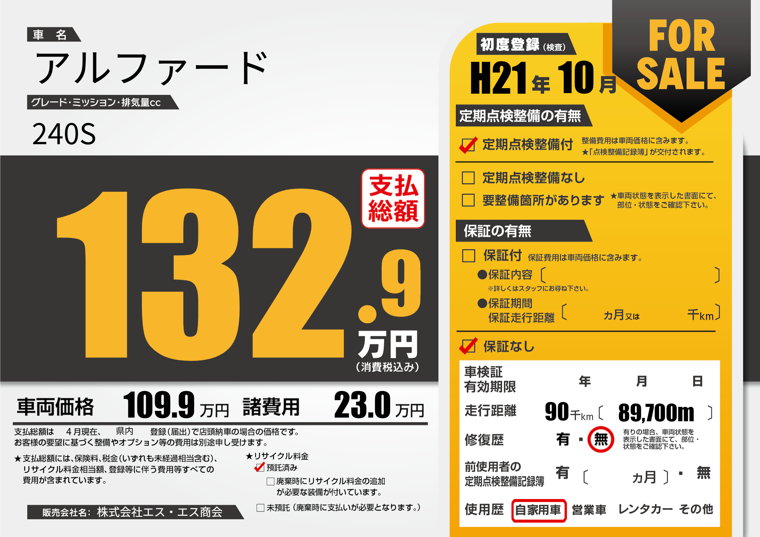 | 走行キロ | 9万km | 初年度登録 | H21年10月 |