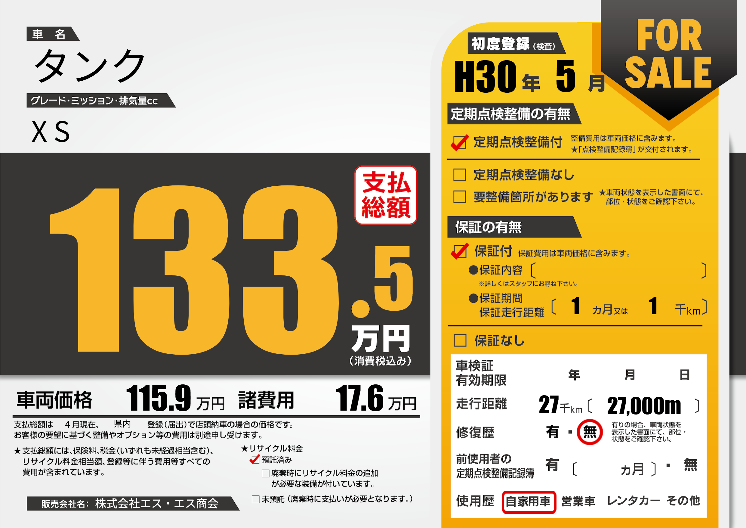| 走行キロ | 2.7万km | 初年度登録 | H30年5月 |