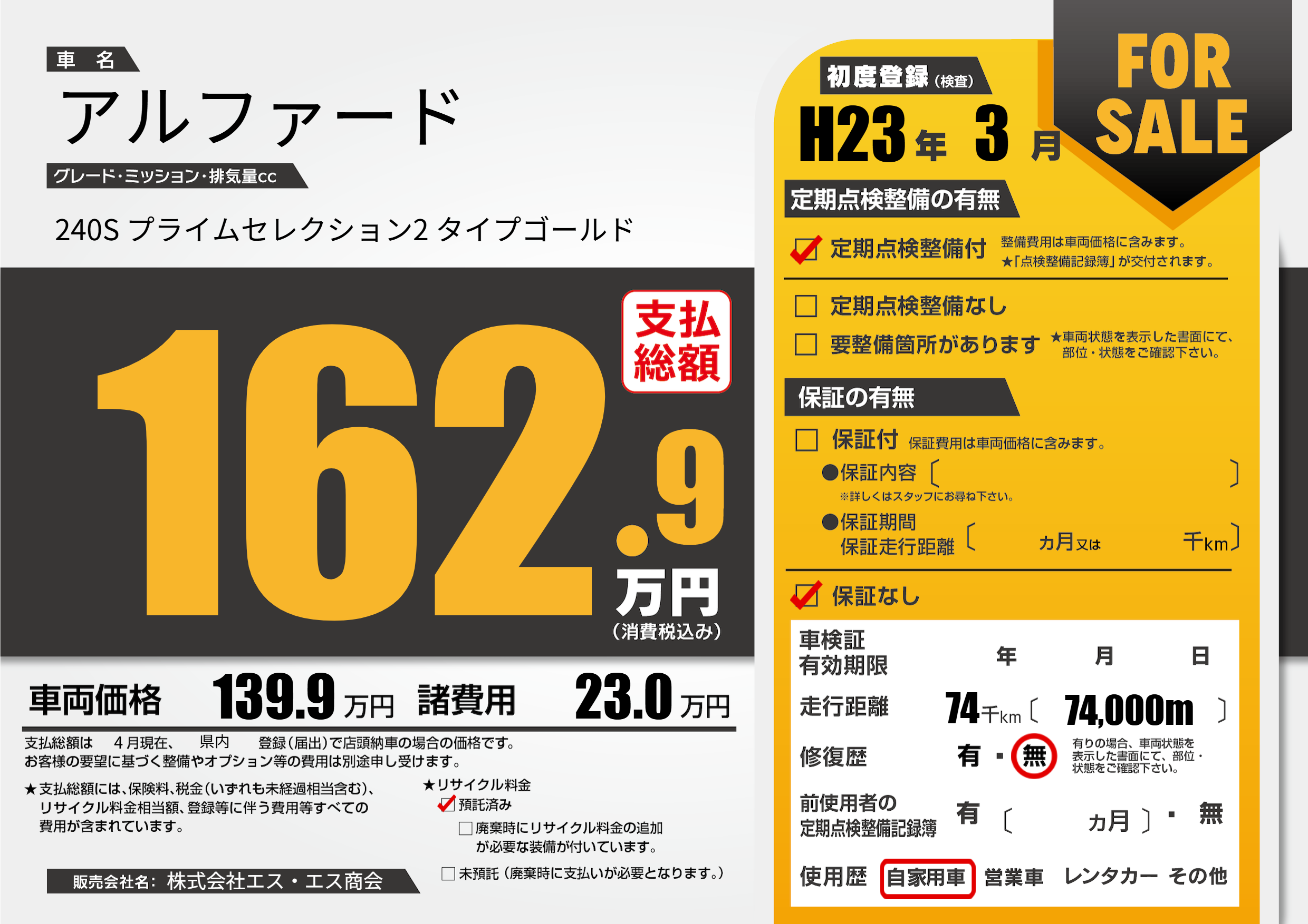 | 走行キロ | 7.4万km | 初年度登録 | H23年3月 |