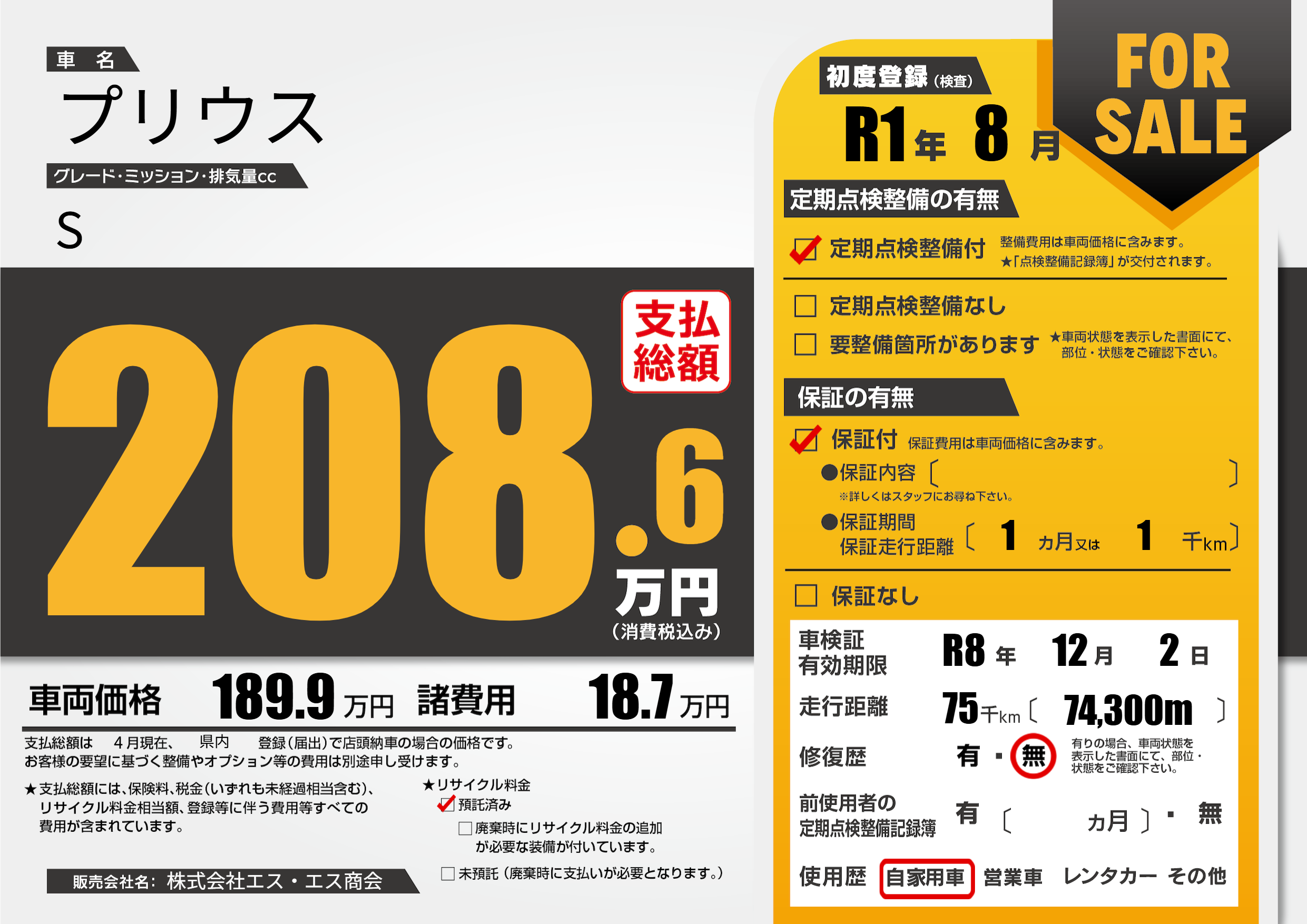 | 車名 | プリウス | グレード ミッション 排気量 |