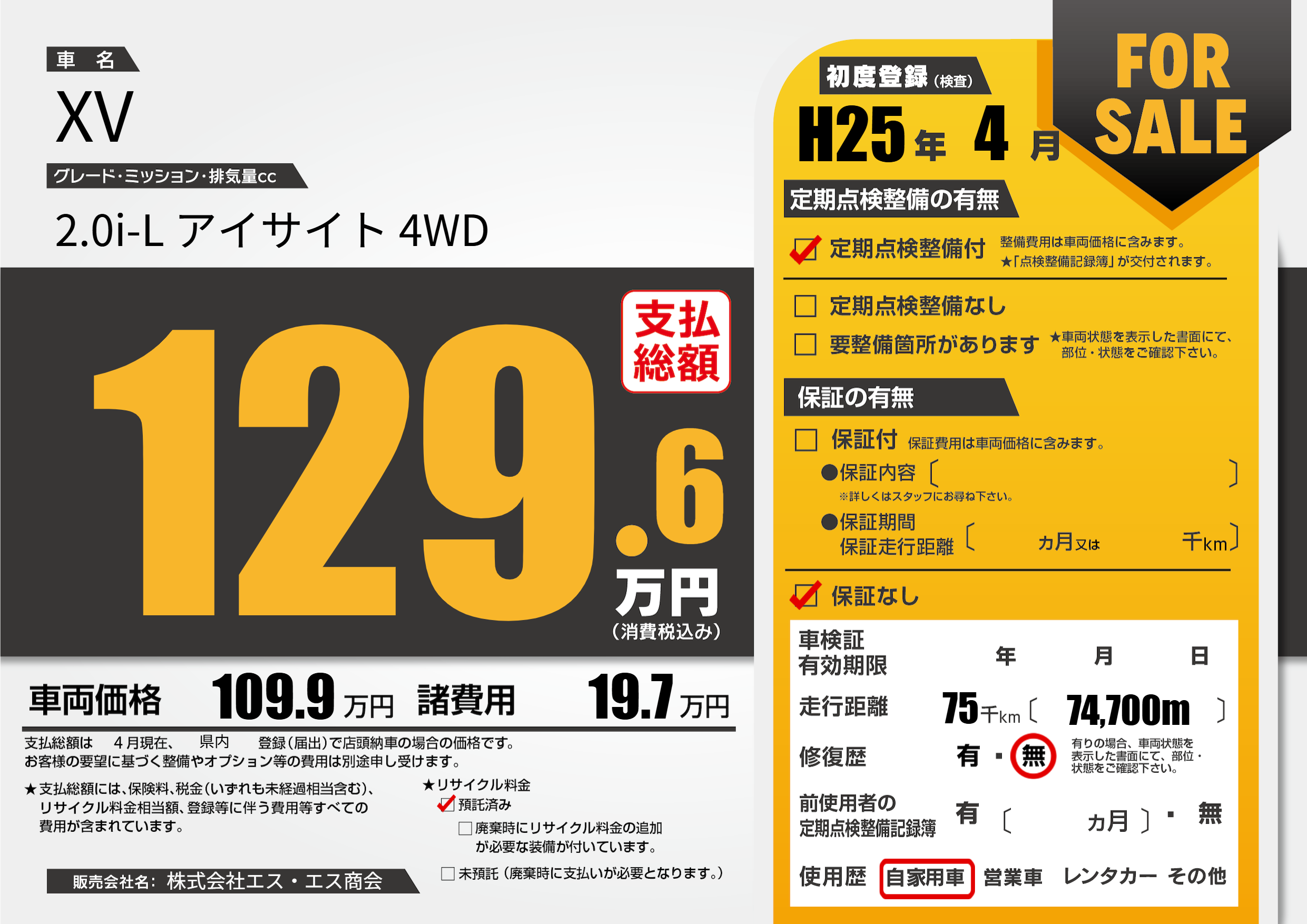 | 走行キロ | 7.5万km | 初年度登録 | H25年4月 |
