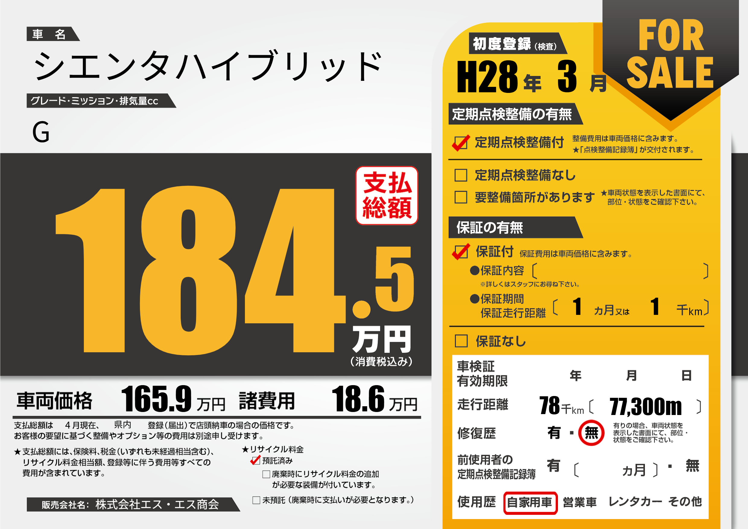 | 車名 | シエンタハイブリッド | グレード ミッション 排気量 |