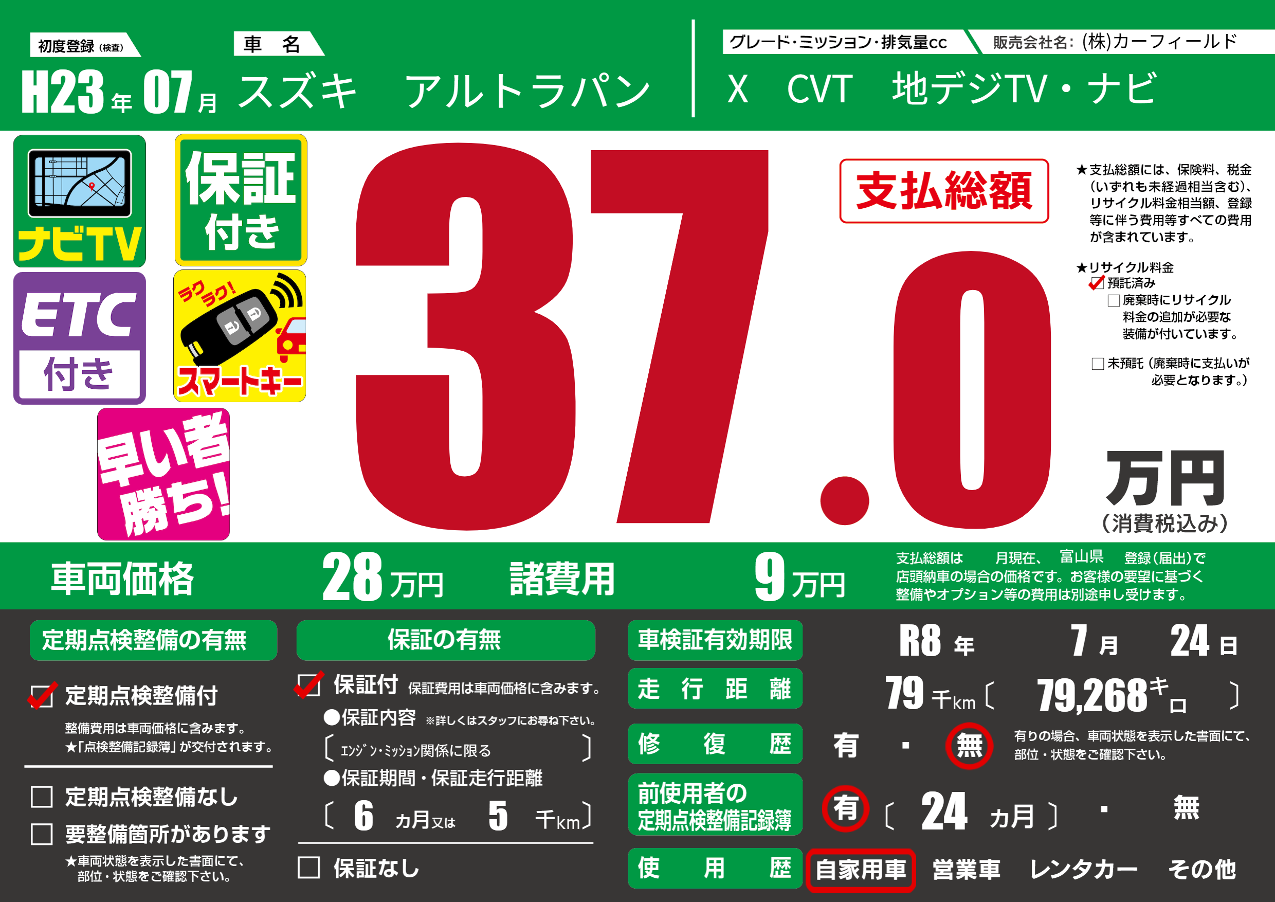 | 走行キロ | 7.9万km | 初年度登録 | H23年07月 |