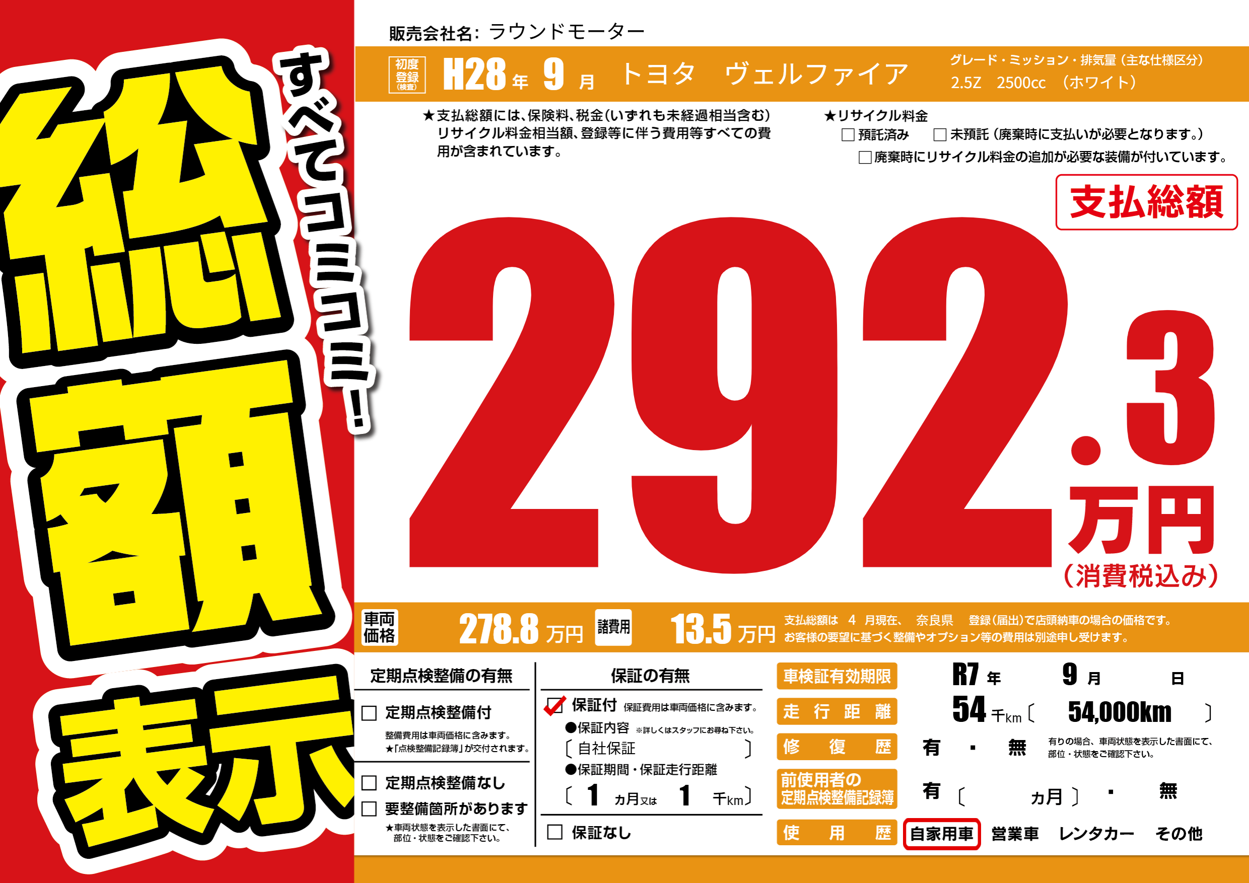 | 車名 | トヨタ ヴェルファイア | グレード ミッション 排気量 |