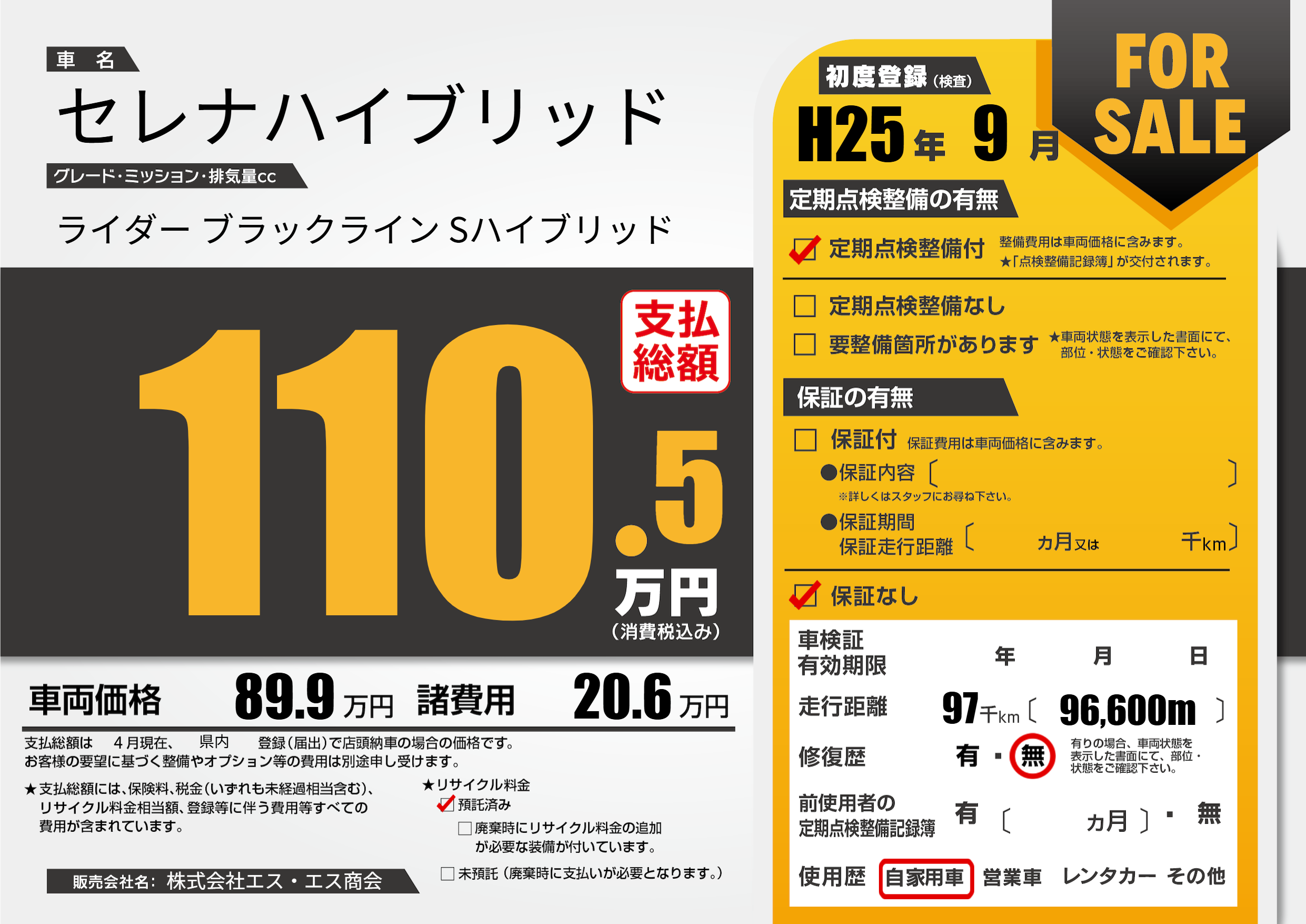 | 走行キロ | 9.7万km | 初年度登録 | H25年9月 |