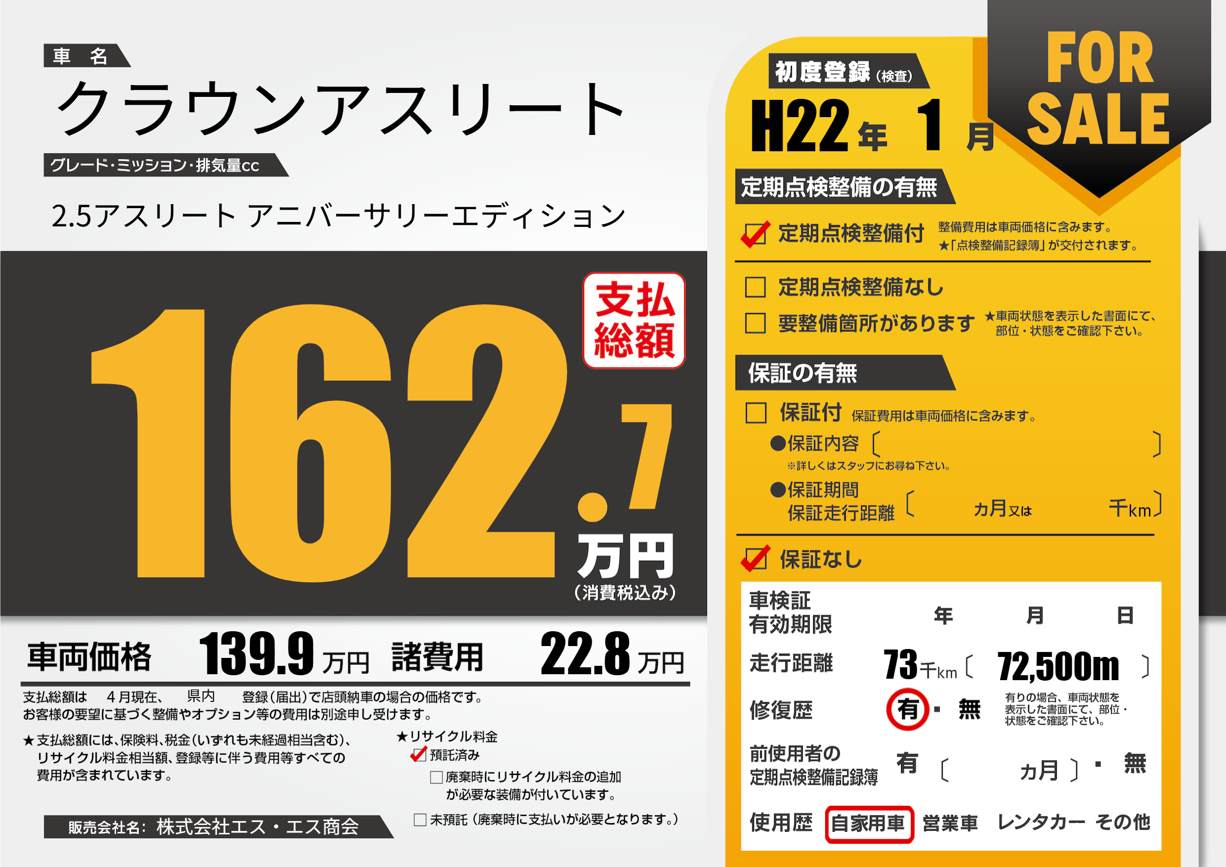 | 車名 | クラウンアスリート | グレード ミッション 排気量 |