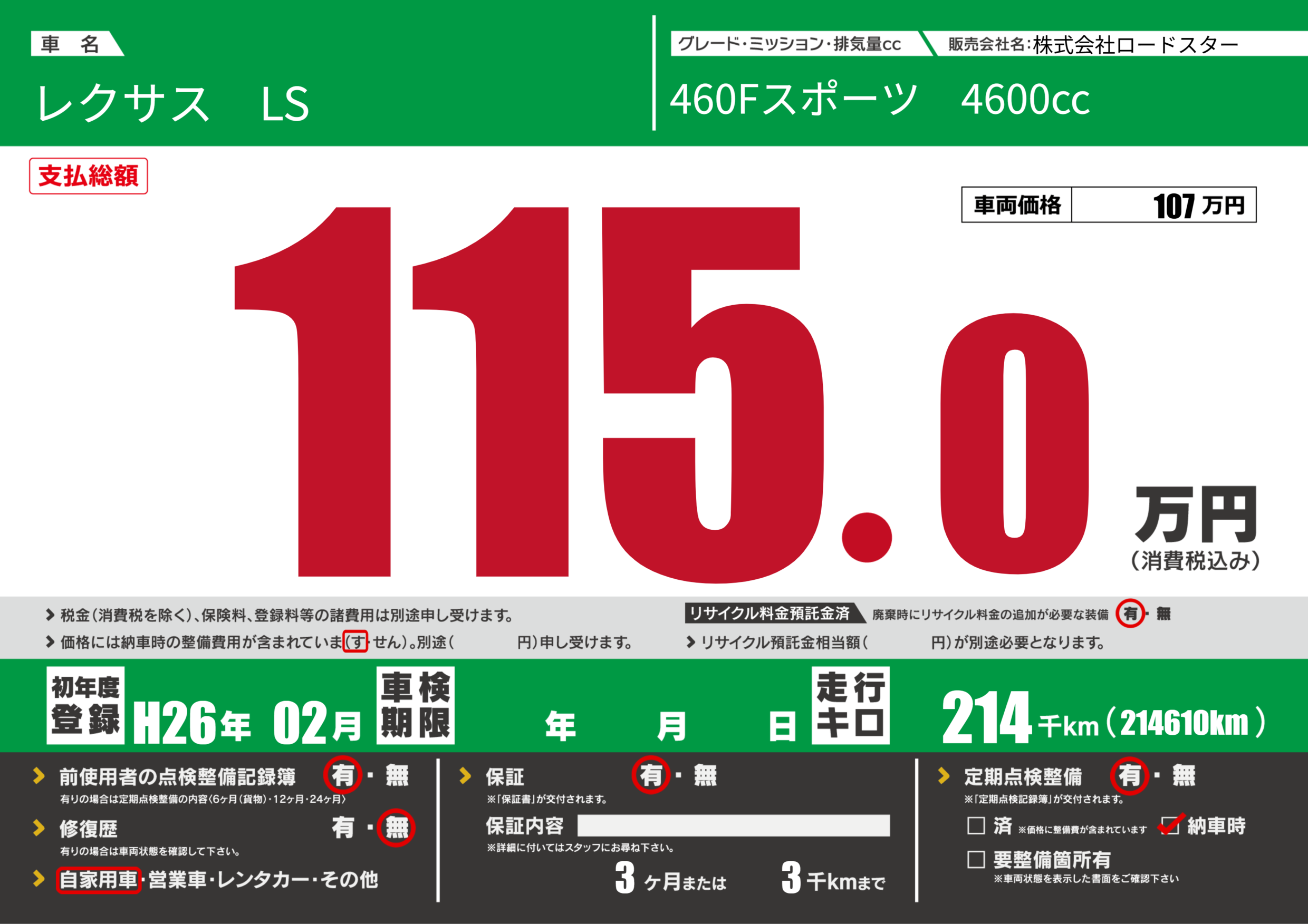 | 定期点検整備 | 定期点検整備あり 納車時あり | ||