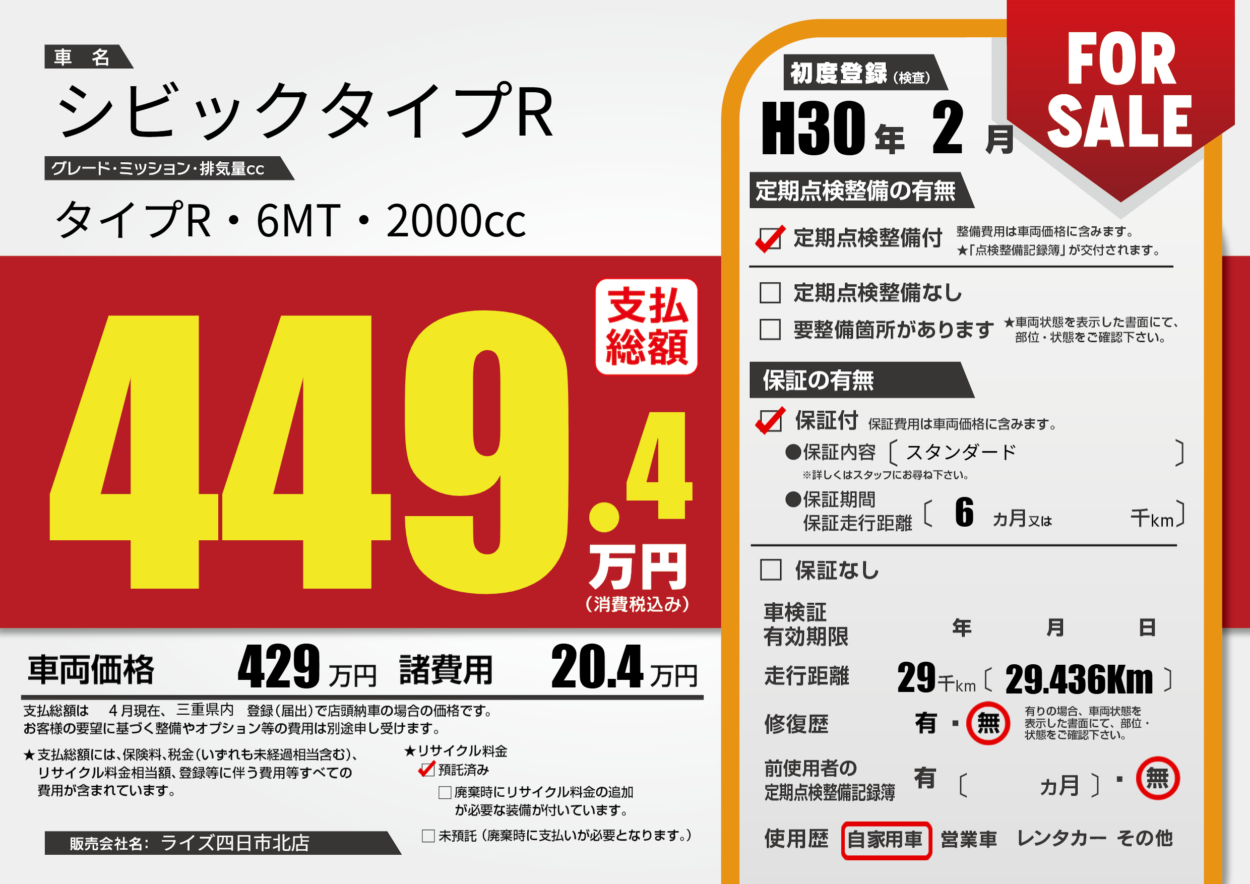 | 車名 | シビックタイプR | グレード ミッション 排気量 |