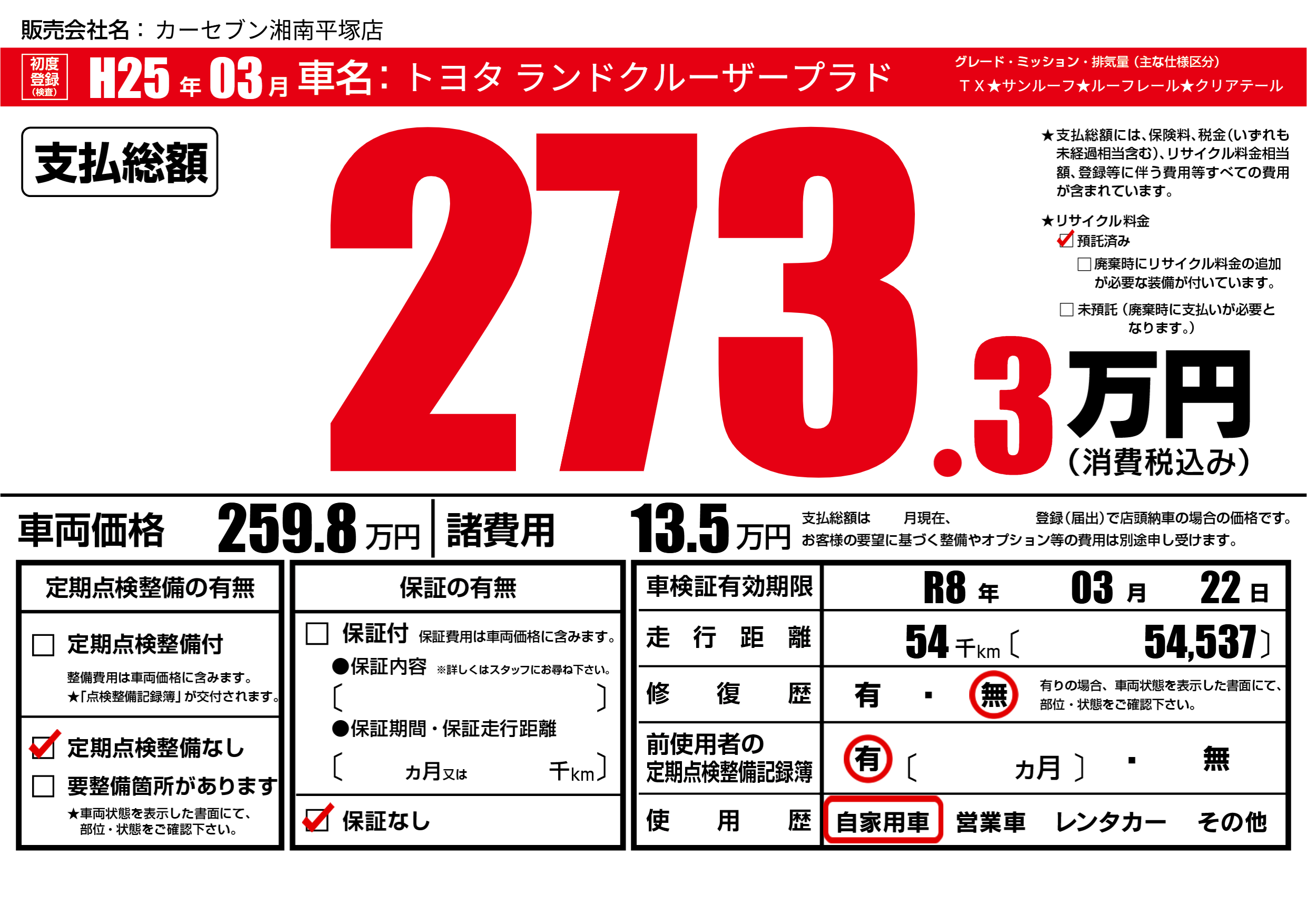 | 車名 | トヨタ ランドクルーザープラド | グレード ミッション 排気量 |