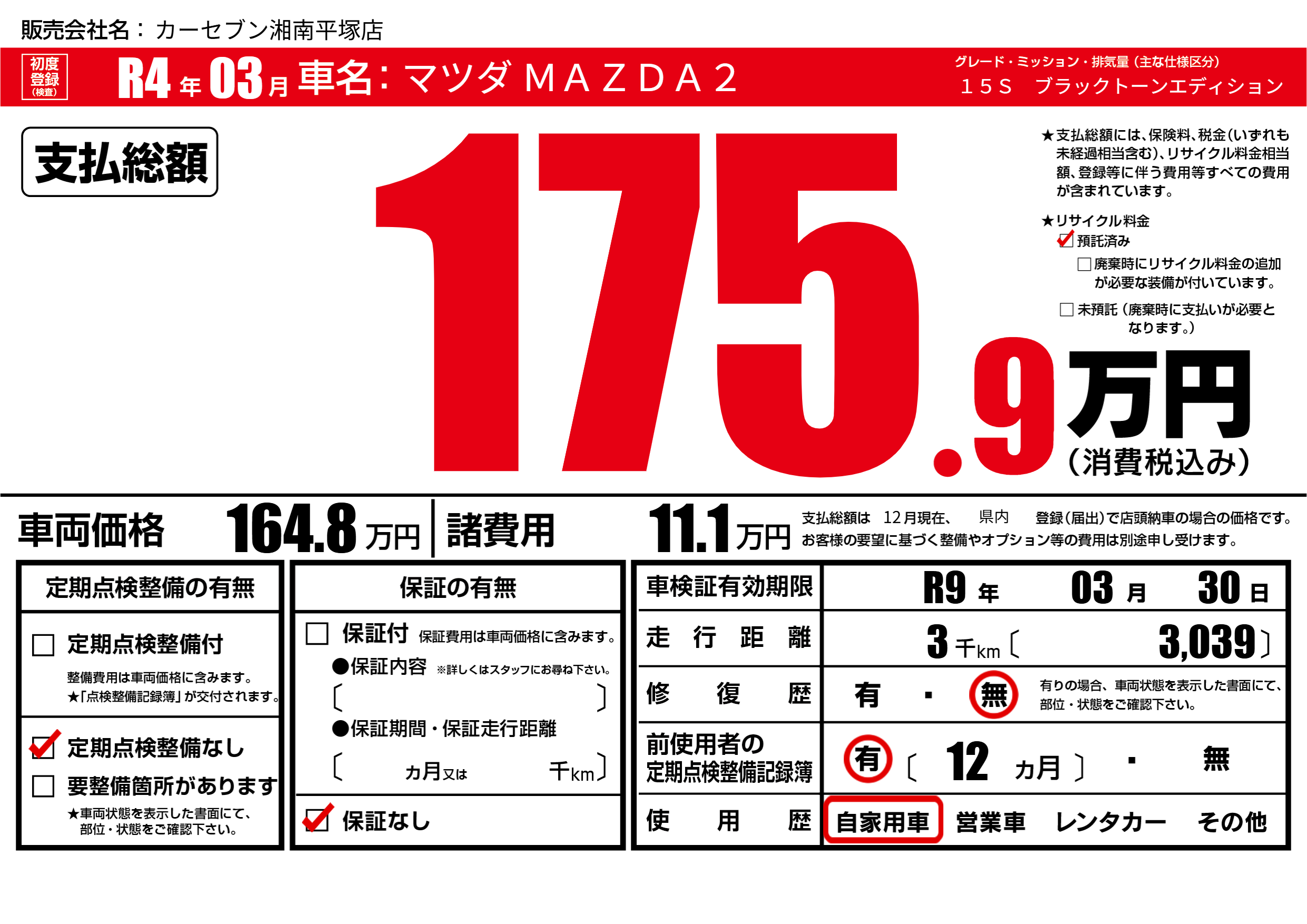 | 車名 | マツダ MAZDA2 | グレード ミッション 排気量 |