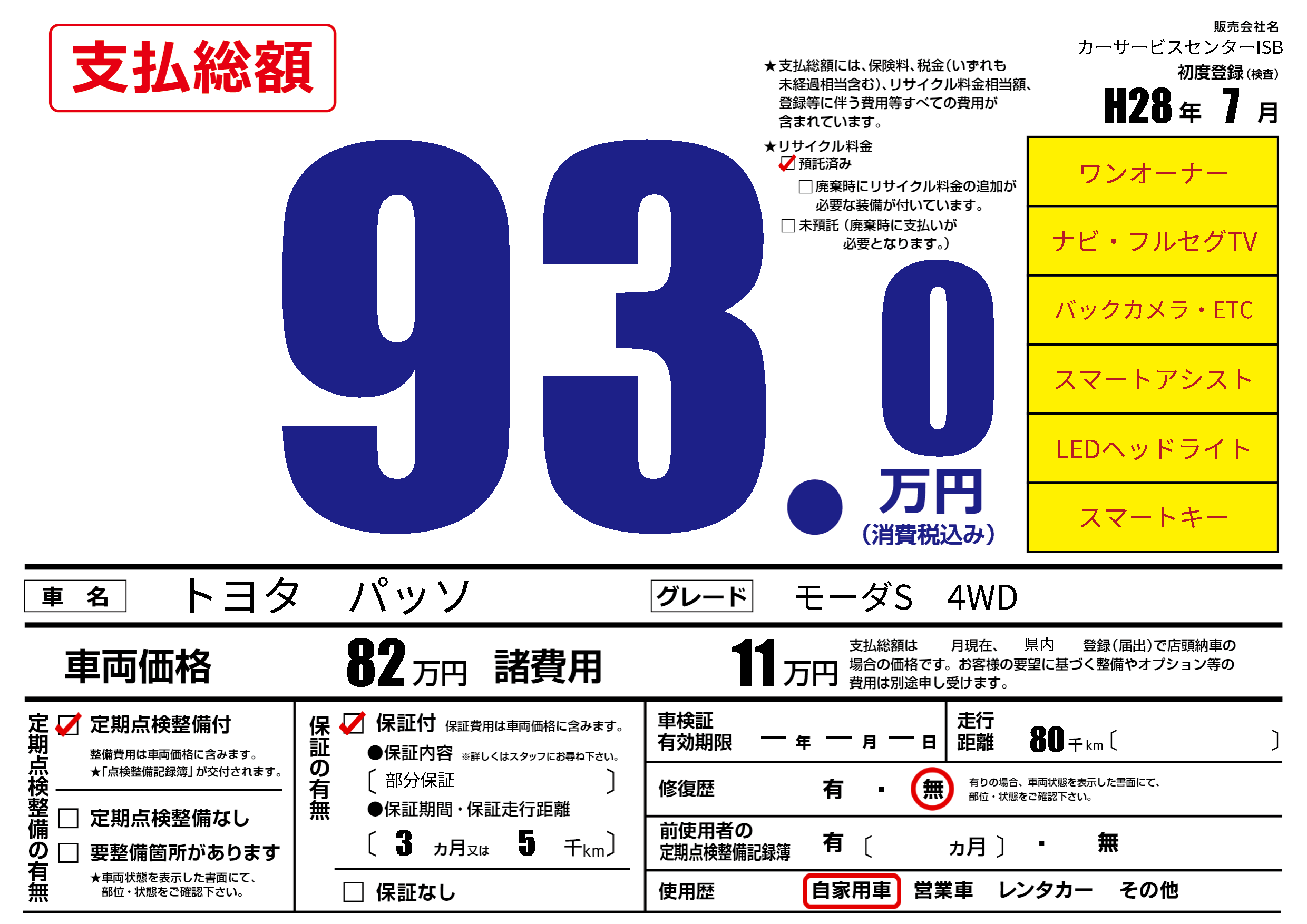 | 車名 | トヨタ パッソ | グレード ミッション 排気量 |
