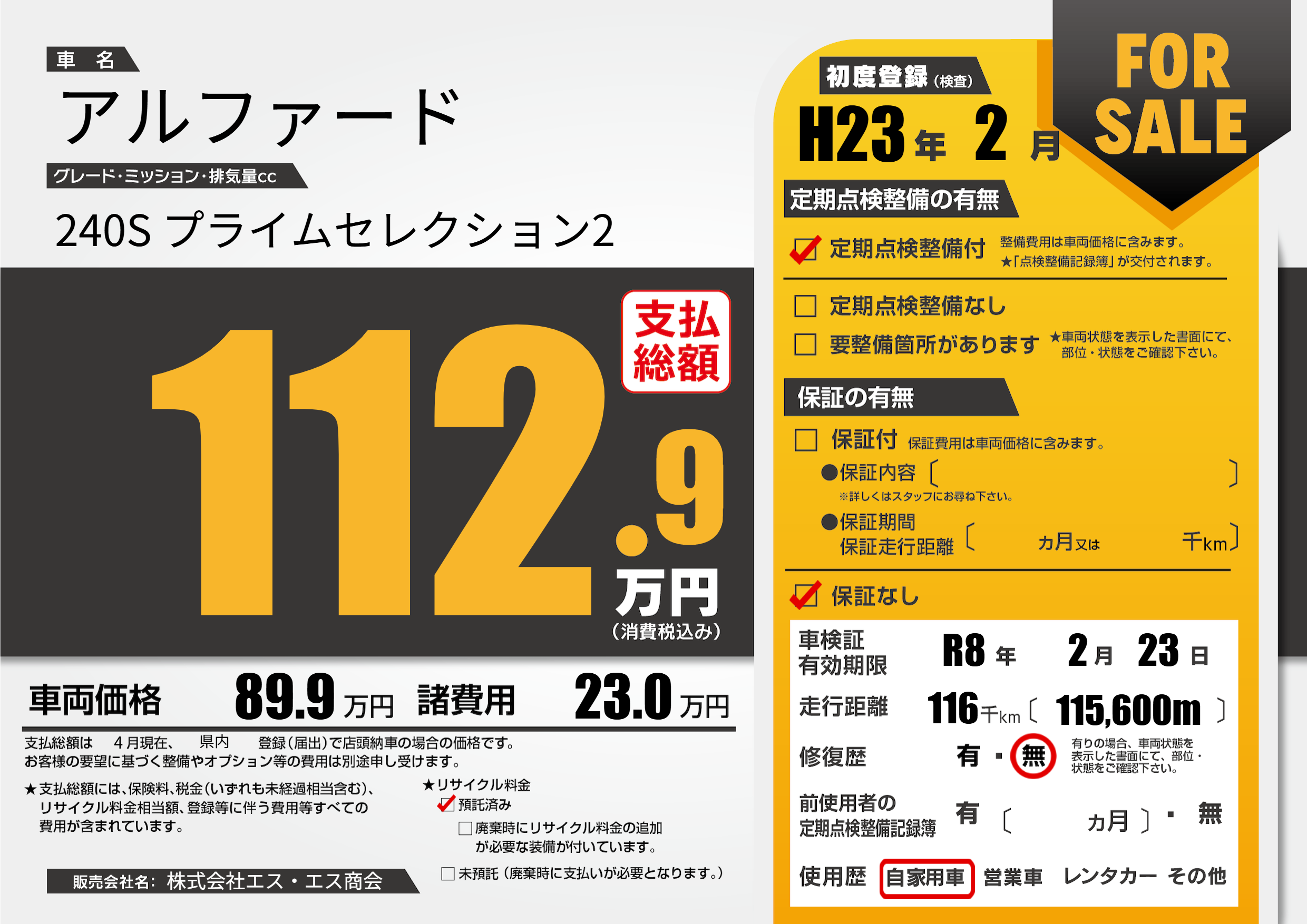 | 走行キロ | 11.6万km | 初年度登録 | H23年2月 |