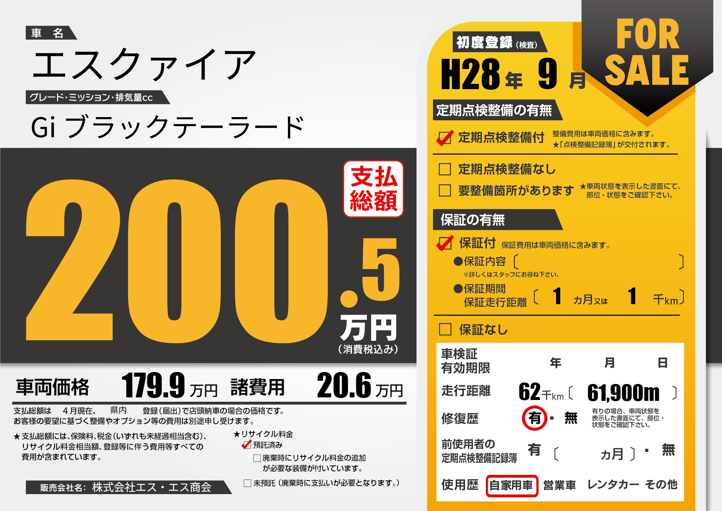| 車名 | エスクァイア | グレード ミッション 排気量 |