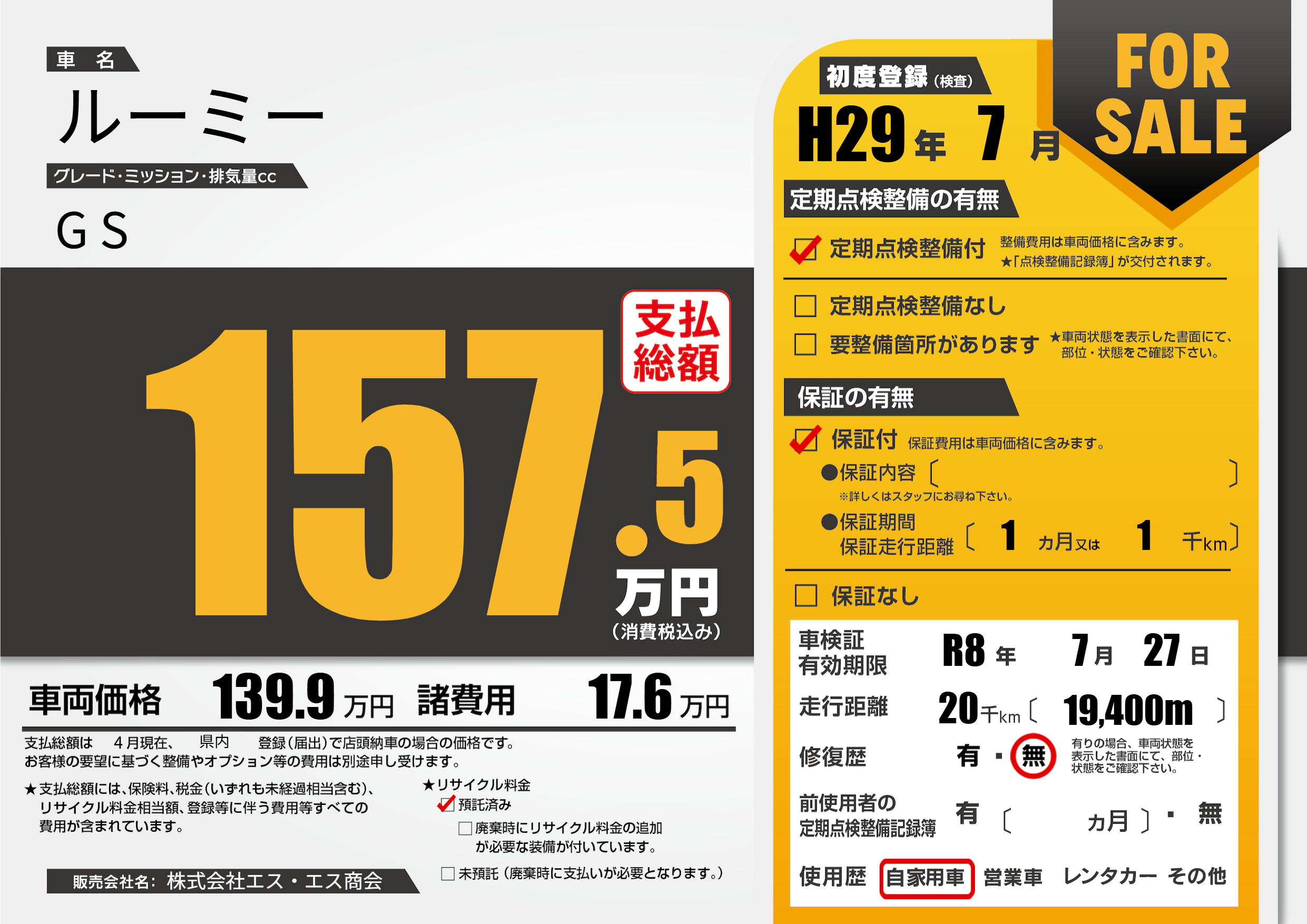 | 車名 | ルーミー | グレード ミッション 排気量 |