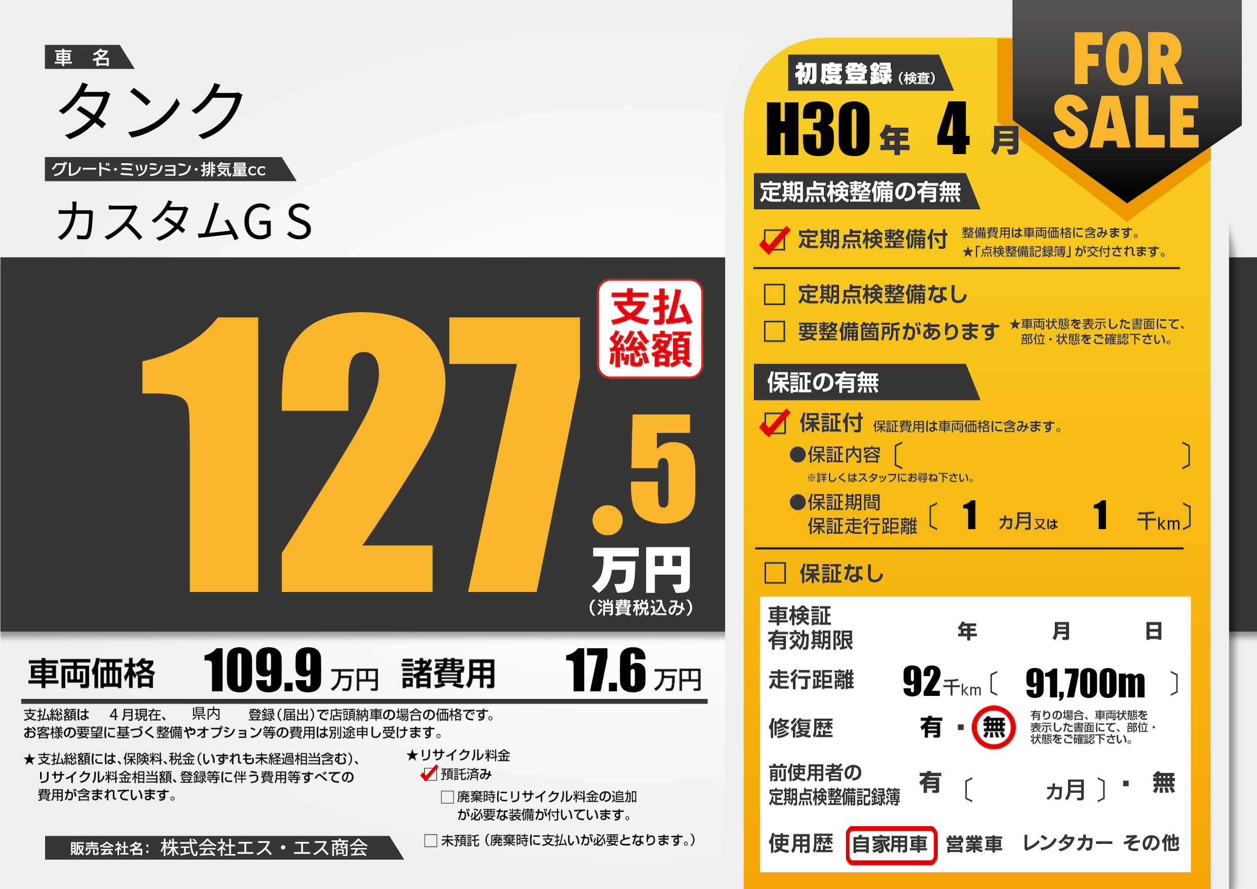 | 走行キロ | 9.2万km | 初年度登録 | H30年4月 |