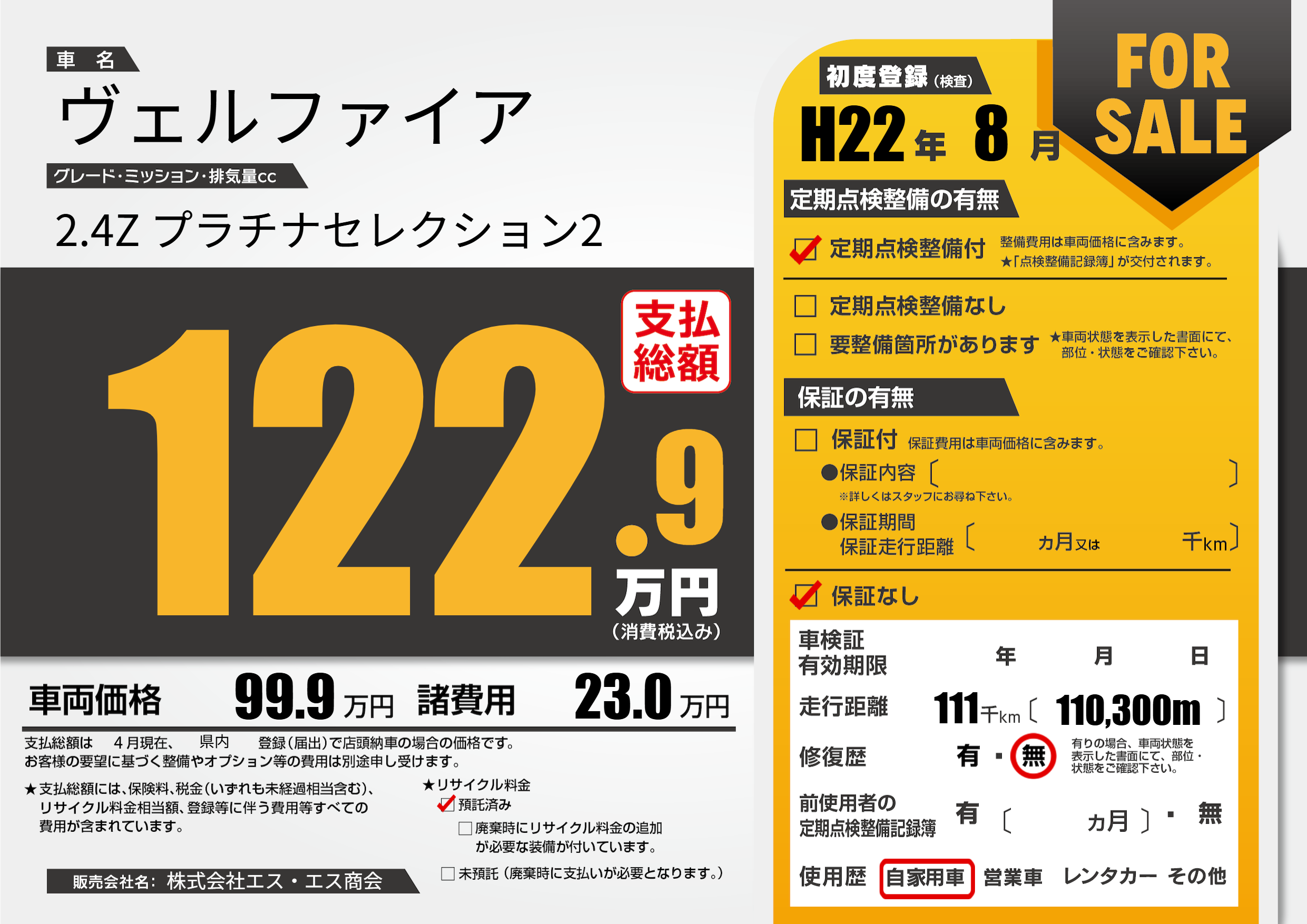 | 走行キロ | 11.1万km | 初年度登録 | H22年8月 |