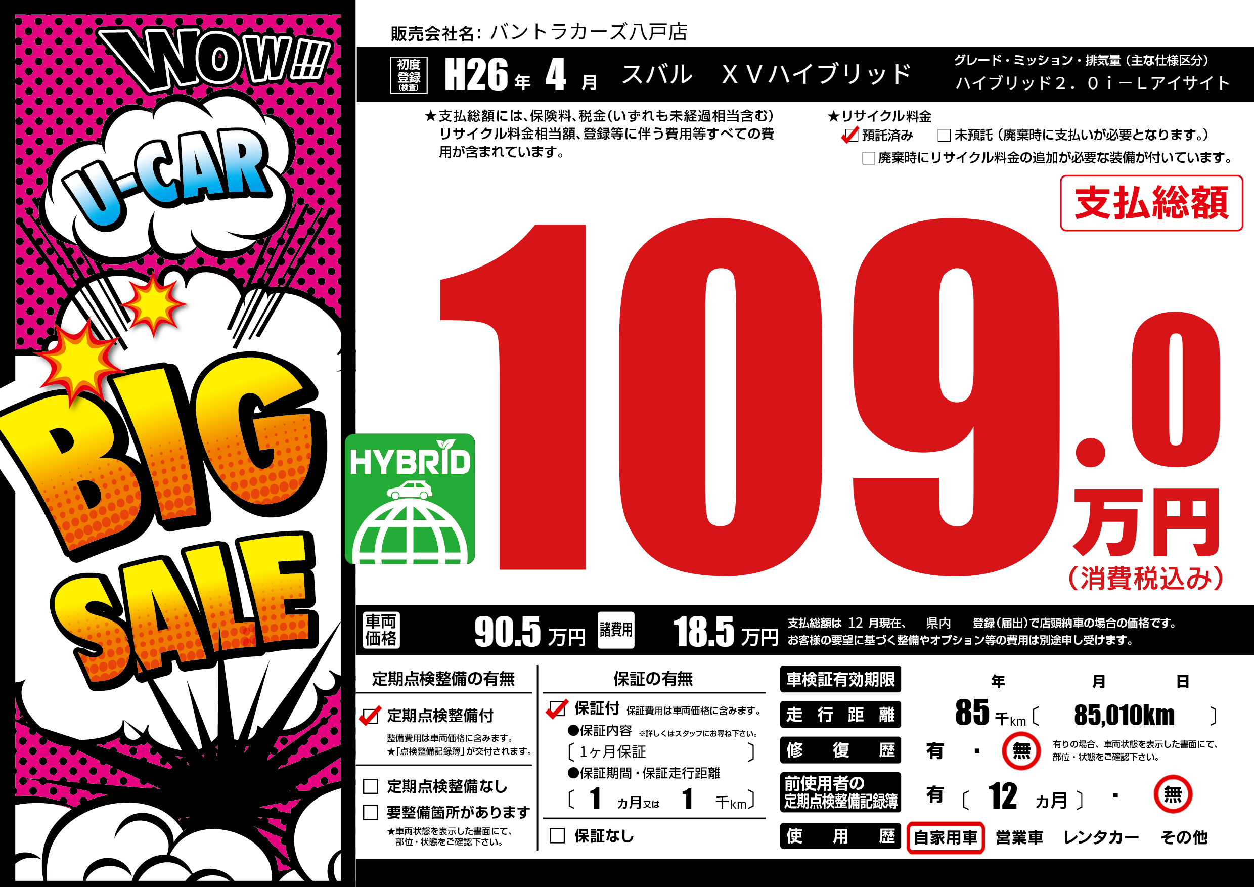 | 車名 | スバル XVハイブリッド | グレード ミッション 排気量 |