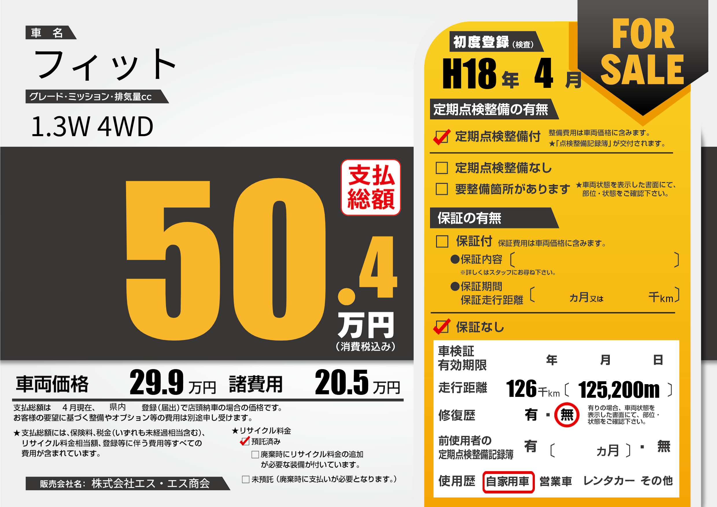| 走行キロ | 12.6万km | 初年度登録 | H18年4月 |