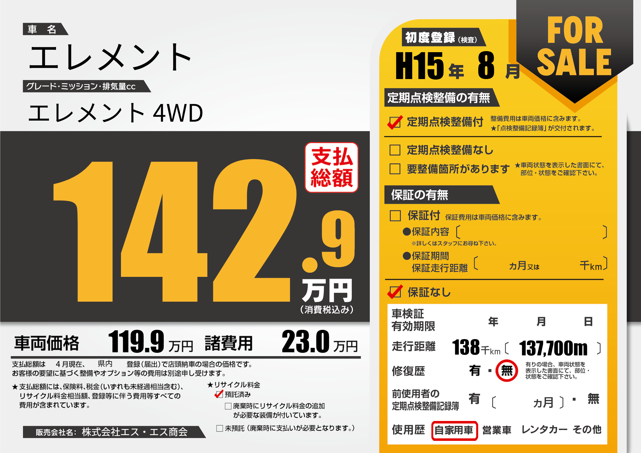 | 走行キロ | 13.8万km | 初年度登録 | H15年8月 |