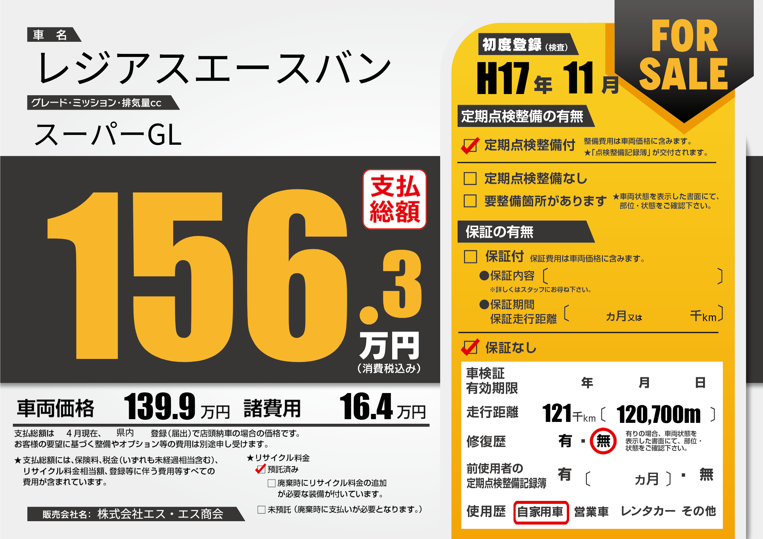 | 走行キロ | 12.1万km | 初年度登録 | H17年11月 |