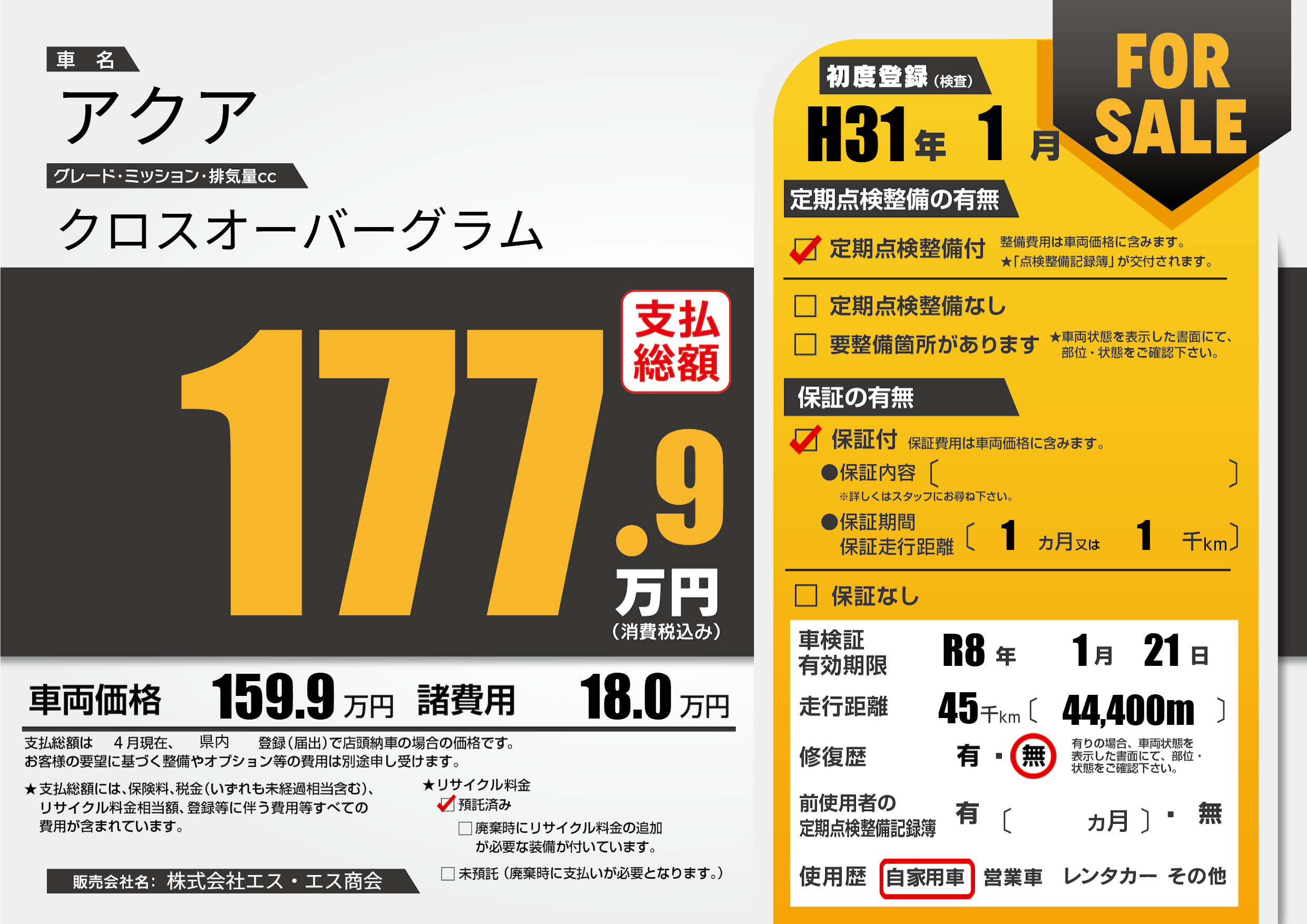 | 走行キロ | 4.5万km | 初年度登録 | H31年1月 |