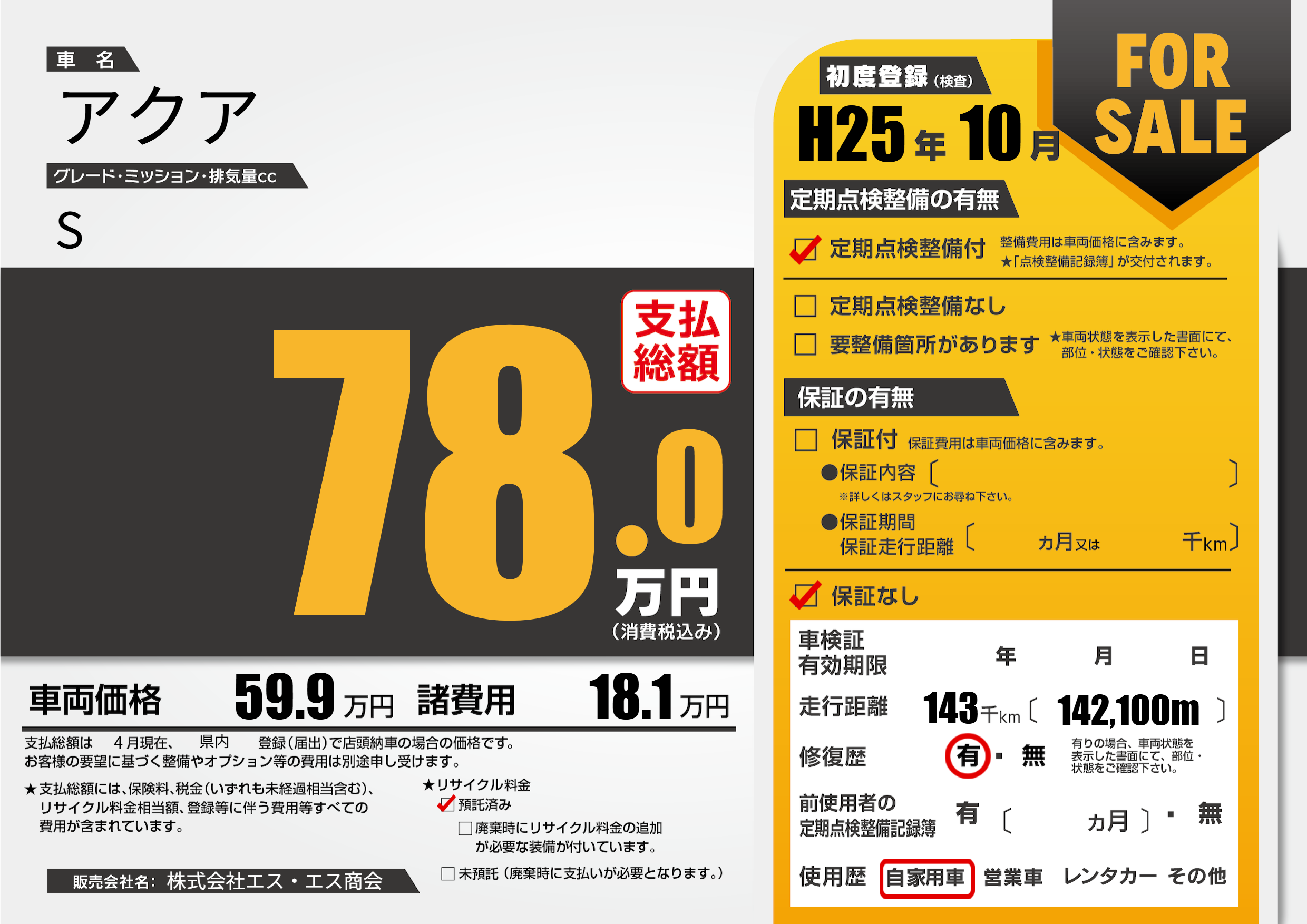 | 走行キロ | 14.3万km | 初年度登録 | H25年10月 |